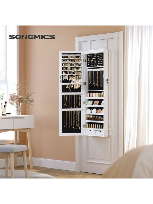 Robustná MDF konštrukcia zaisťuje dlhú životnosť, zatiaľ čo zamatová výstelka chráni šperky pred poškriabaním. Možnosť montáže na dvere aj stenu vám ušetrí miesto a bezpečnostný zámok ochráni vaše cennosti.