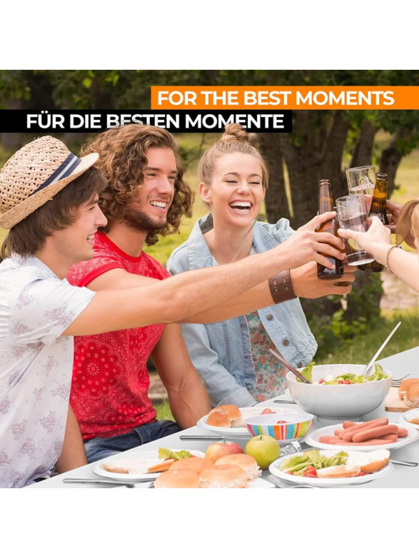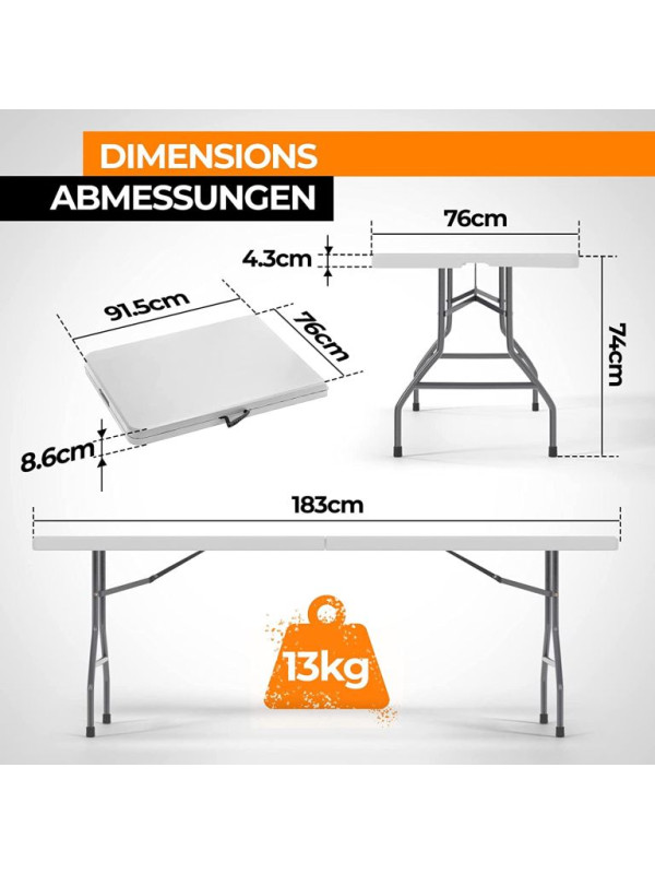 Tento všestranný skladací stôl je ideálny pre záhradnú párty s priateľmi, rodinnú večeru aj narodeniny detí. Vďaka svojej veľkosti je možné bufetový stôl používať vonku aj vovnútri. Stôl je možné ľahko zložiť, takže ho možno ľahko skladovať a prepravovať vďaka integrovanej rukoväti a nízkej hmotnosti. Stabilitu zaisťujú robustné nohy s gumovými krytkami. Robustné oceľové nohy a doska stola z HDPE plastu odolná proti poškriabaniu s maximálnou nosnosťou 150 kg robia z tohto stola odolný kus nábytku.