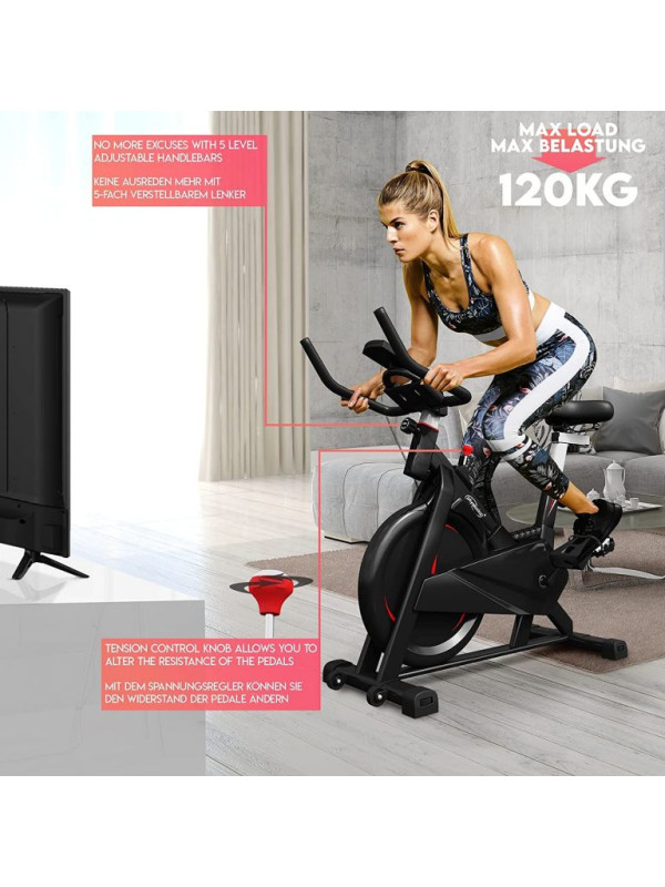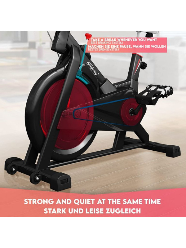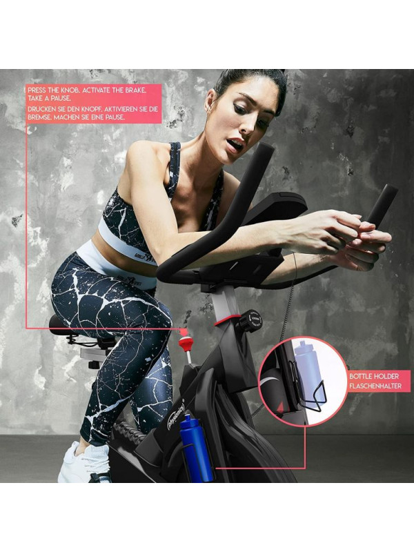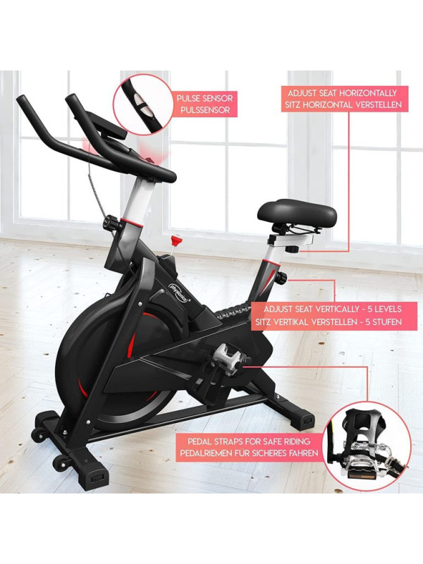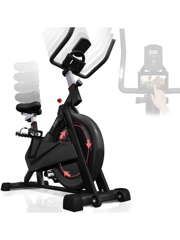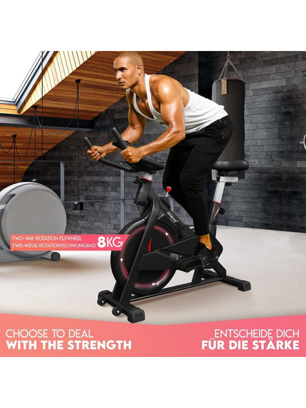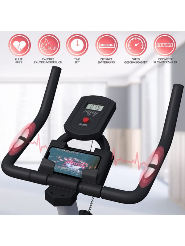 Zdravý životný štýl je vďaka nášmu stacionárnemu rotopedu oveľa jednoduchší. Tento rychlostný trenažér zlepšuje fyzickú vytrvalosť, spevňuje svaly a zlepšuje celkovú pohodu. Rotoped je ideálny pomocník, nielen pre športovcov s praktickým držiakom na fľašu a popruhmy na pedále pre bezpečný tréning. LCD displej cyklistického bicykla zobrazuje čas, rýchlosť, vzdialenosť, spálené kalórie, pulz a má aj počítadlo kilometrov; batérie nie sú súčasťou balenia. Cyklotrenažér poskytuje efektívny vytrvalostný tréning pre užívateľov s maximálnou hmotnosťou do 120 kg a 8 kg zotrvačník, ktorý je obojstranne otočiteľný. Snímač tepu je umiestnený na riadidlách.