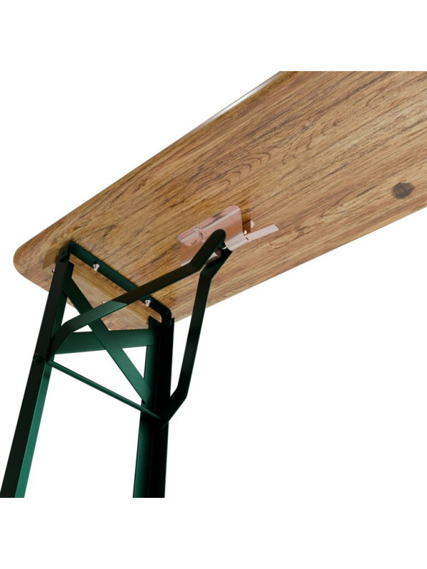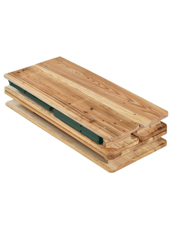 Stôl aj lavice sú vyrobené z lakovaného jedlového dreva a podoprené pevnou oceľovou konštrukciou. Lavice navyše dopĺňajú stredové nohy pre vyššiu stabilitu, vďaka ktorým unesú až 250 kg. Súčasťou balenia je 16 chráničov nôh proti poškodeniu podlahy. Celý set je možné jednoducho zložiť a uložiť, takže zaberie minimum miesta a ľahko sa prenáša.