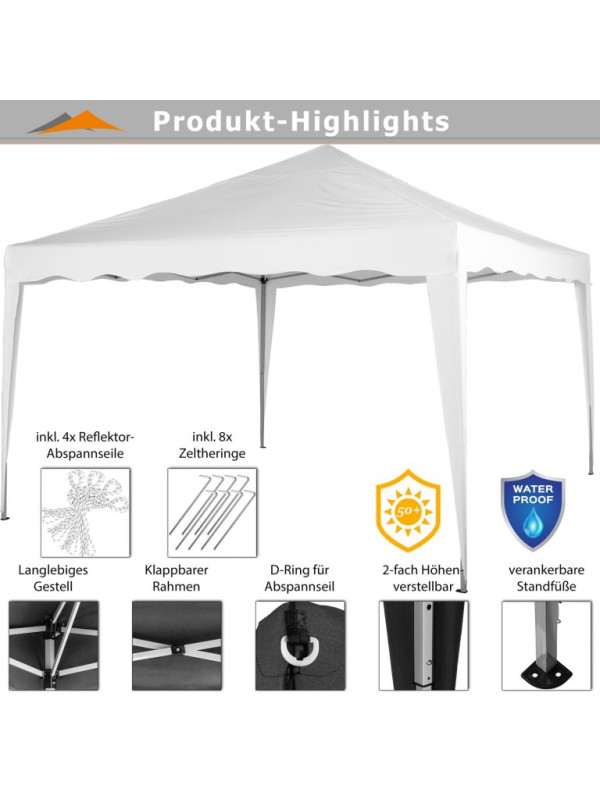 Ideálny pre oslavy, festivaly, športové podujatia, blšie trhy alebo len k pokojnému rodinnému posedeniu pospolu. Vďaka predmontovanému nožnicovému rámu a teleskopickým tyčiam stan ľahko postavíte a zložíte. Priedušný altánok Vás ochráni pred silným slnkom a poskytne Vám tieň. Párty stan obsahuje 4 bočnice, dve s oknami a dve plné.