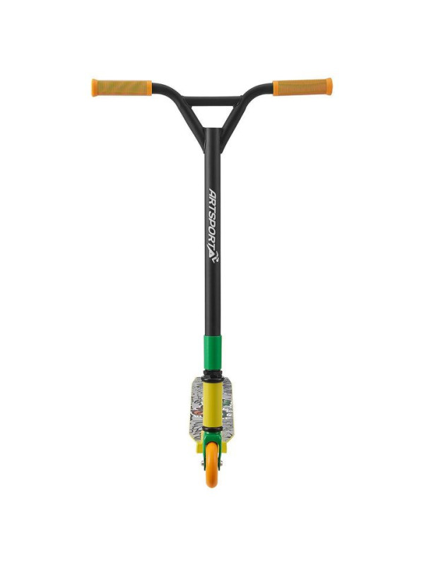 Stabilná konštrukcia z hliníka a ocele zaručuje bezpečnosť pri jazde a skákaní. 100 mm PU kolieska s hliníkovým jadrom a ložiskami ABEC 9 zaručujú plynulú a rýchlu jazdu. Otočné riadidlá o 360°, TPR rukoväte a protišmykový povrch umožňujú ľahké ovládanie a pohodlie. Kolobežka je čiastočne zmontovaná a pripravená na okamžité použitie.