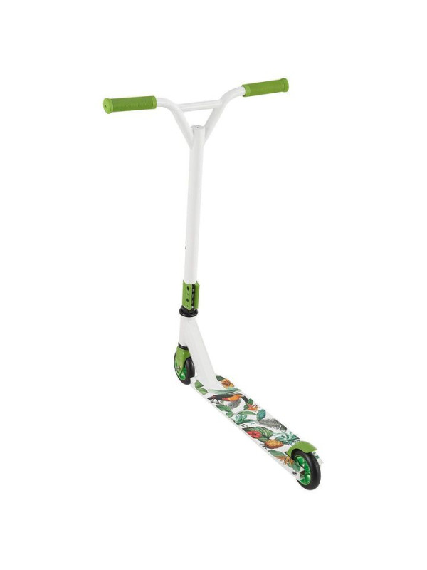 Stabilná konštrukcia z hliníka a ocele zaručuje bezpečnosť pri jazde a skákaní. 100 mm PU kolieska s hliníkovým jadrom a ložiskami ABEC 9 zaručujú plynulú a rýchlu jazdu. Otočné riadidlá o 360°, TPR rukoväte a protišmykový povrch umožňujú ľahké ovládanie a pohodlie. Kolobežka je čiastočne zmontovaná a pripravená na okamžité použitie.