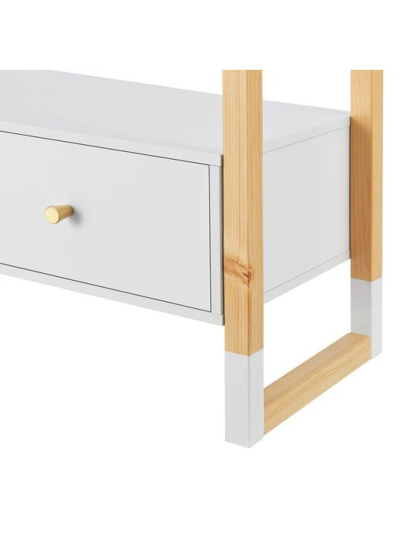 Kombinácia borovicového dreva a bielej MDF zaisťuje pevnosť a odolnosť. Veľká zásuvka je praktická na uloženie doplnkov, hračiek alebo obuvi. Montáž je intuitívna a údržba veľmi jednoduchá.