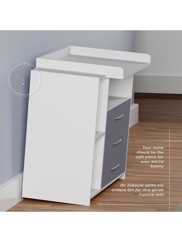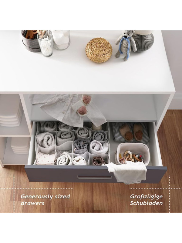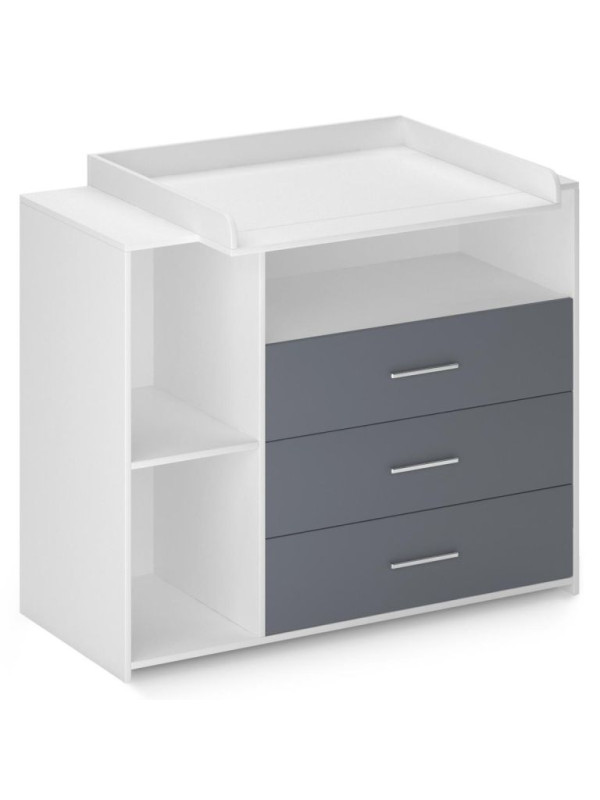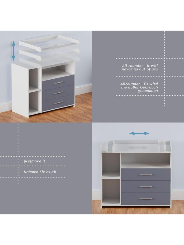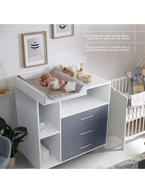 Prebaľovanie na veľkej prebaľovacej ploche - plienky, oblečenie, výrobky pre starostlivosť o dieťa a ďalšie veci na dosah zaistia Vám aj Vášmu dieťaťu pohodlie. Biela farba tohto detského nábytku sa ľahko hodí do rôznych štýlov interiérov. Akonáhle vaše dieťa prebaľovaciemu veku odrastie, môžete prebaľovaciu podložku tohto multifunkčného kusu nábytku jednoducho natrvalo odstrániť. Komoda tak môže byť používaná aj naďalej.