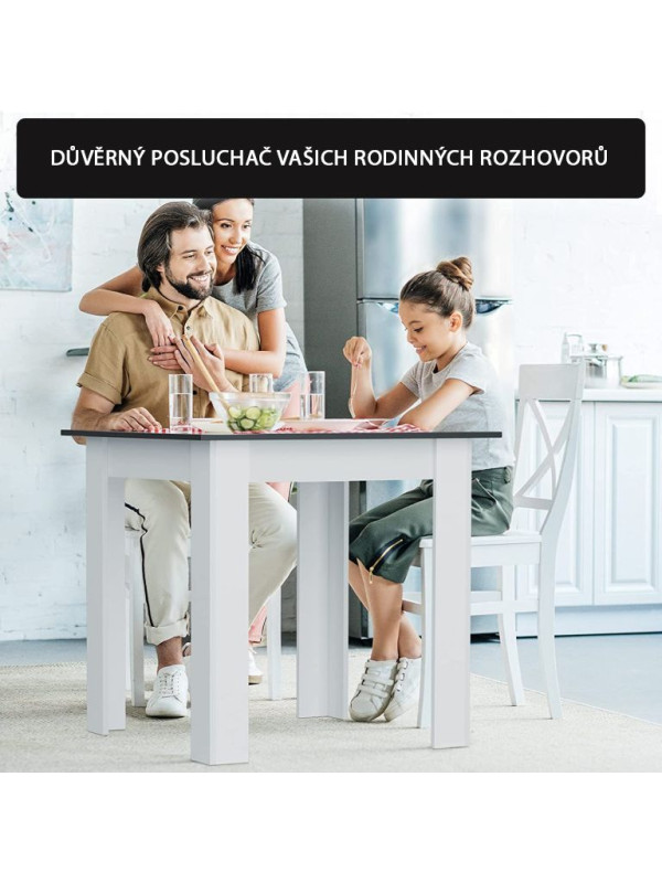 Tento elegantný jedálenský stôl sa hodí do každého bytu a domu. Kompaktná veľkosť tohto jedálenského stola je ideálna do malej kuchyne aj obývačky. Kuchynský stôl je vyrobený z ľahko udržiavateľnej MDF konštrukcie s bielymi nohami a stolnou doskou v čiernej farbe, povlak z melamínovej živice sľubuje dlhú životnosť. Tento tradičný stôl je tou správnou voľbou na spojenie rôznych štýlov. Nadčasový dizajn tohto jedálenského stola doplní každú miestnosť.
