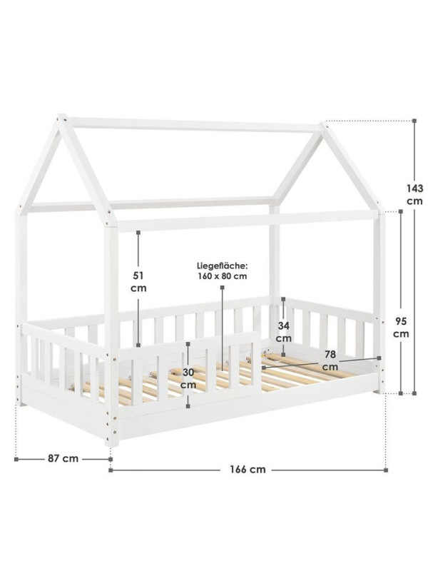 Táto detská posteľ s rozmermi 80 × 160 cm má moderný škandinávsky dizajn, ktorý premení každú detskú izbu na kreatívny a príjemný priestor. Pevný rám z kvalitného borovicového dreva a stabilný rošt zabezpečujú bezpečný a pohodlný spánok pre deti vo veku približne od 3 do 10 rokov. Ochranné zábradlie zabraňuje pádom a poskytuje rodičom pokoj počas spánku a odpočinku.
