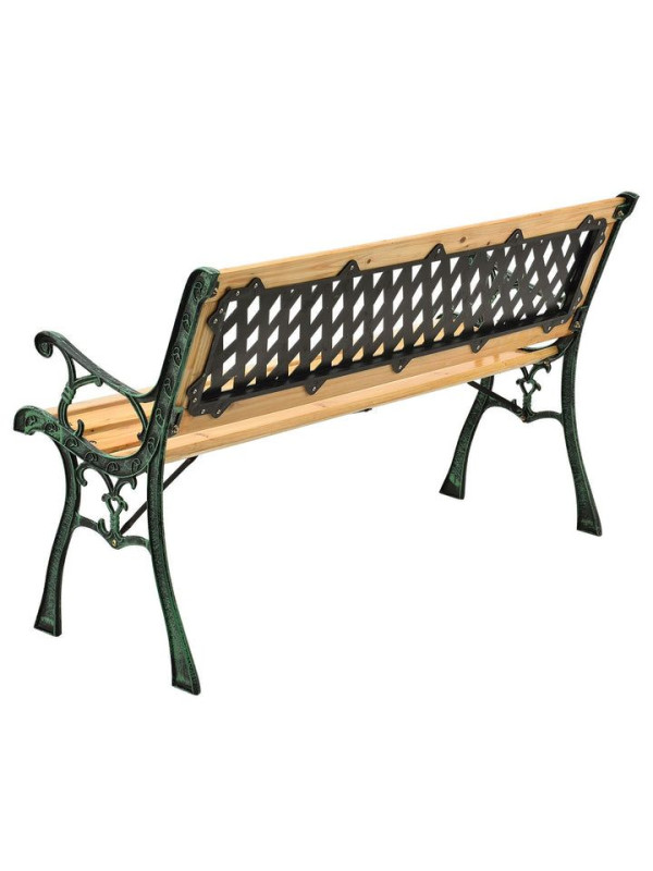 Robustná konštrukcia z lakovaného dreva a liatiny zaručuje dlhú životnosť a odolnosť voči poveternostným vplyvom. Lavica je navrhnutá tak, aby sa ľahko montovala a udržiavala, pričom pevné spojovacie prvky zabezpečujú stabilitu. Praktické podrúčky prispievajú k pohodliu sedenia.