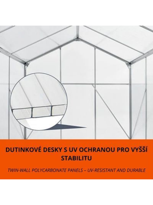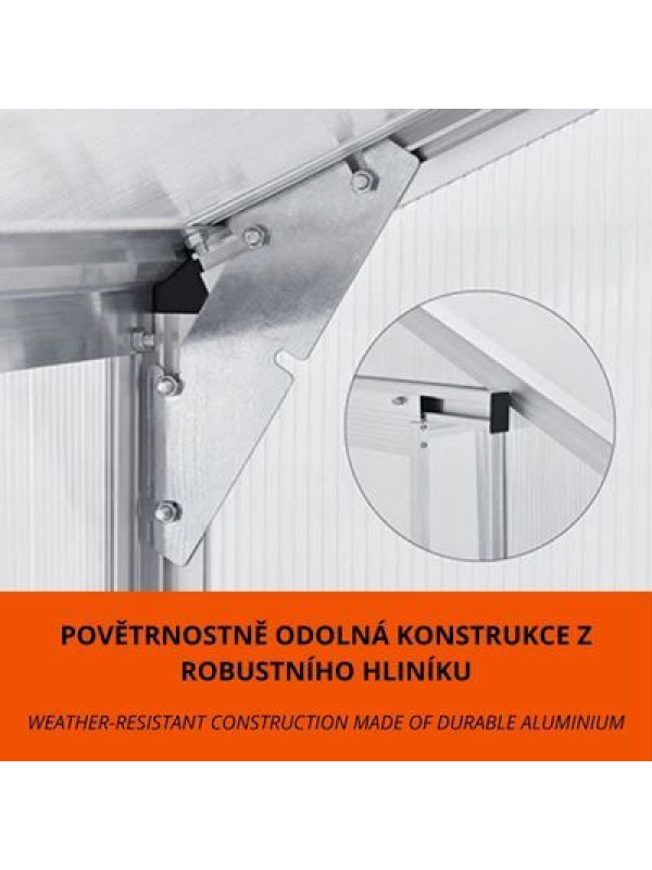 Hliníková konštrukcia je ľahká, ale zároveň mimoriadne pevná, čo zaručuje dlhú životnosť. Polykarbonátové dosky chránia pred UV žiarením a zabezpečujú dostatočné osvetlenie. Základňa z pozinkovanej ocele poskytuje stabilitu a bezpečné ukotvenie. Jednoduchá montáž a údržba potešia každého záhradníka.