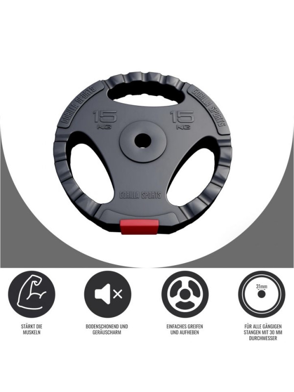 Plastový plášť je zaoblený, a preto je obzvlášť šetrný k podlahe. Vďaka priehlbinám v rukovätiach ju môžete ergonomicky uchopiť a používať ju pri cvičení. Okrem toho má kotúč praktický otvor s priemerom 31 mm, ktorý umožňuje používať závažie navyše na činky alebo činky s tyčou s priemerom 30 mm. Najmä pri "sklapovačkách" so závažím sa môžete cítiť celkom nepríjemne, pokiaľ je ťažké váhu udržať. Riešením je záťažová doska s plastovým úchytom.