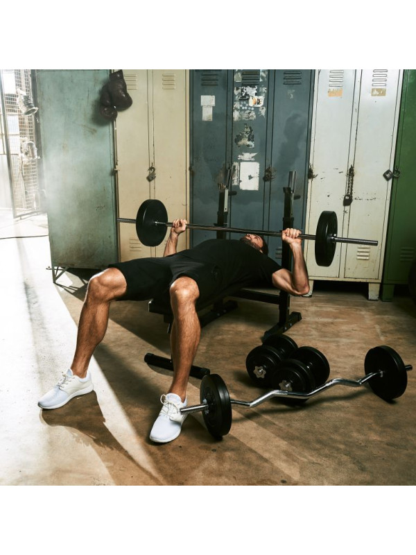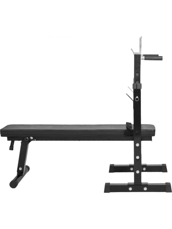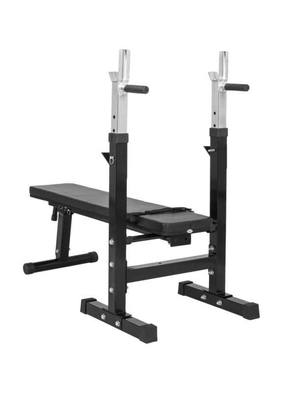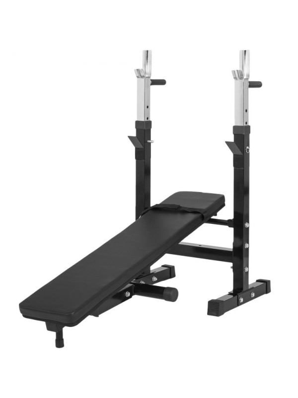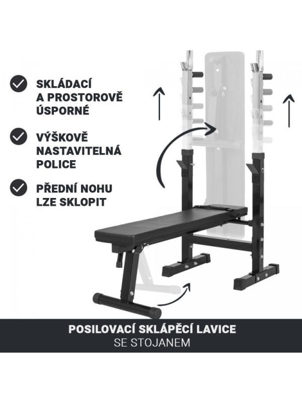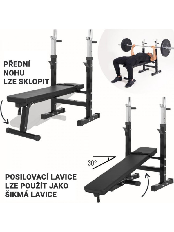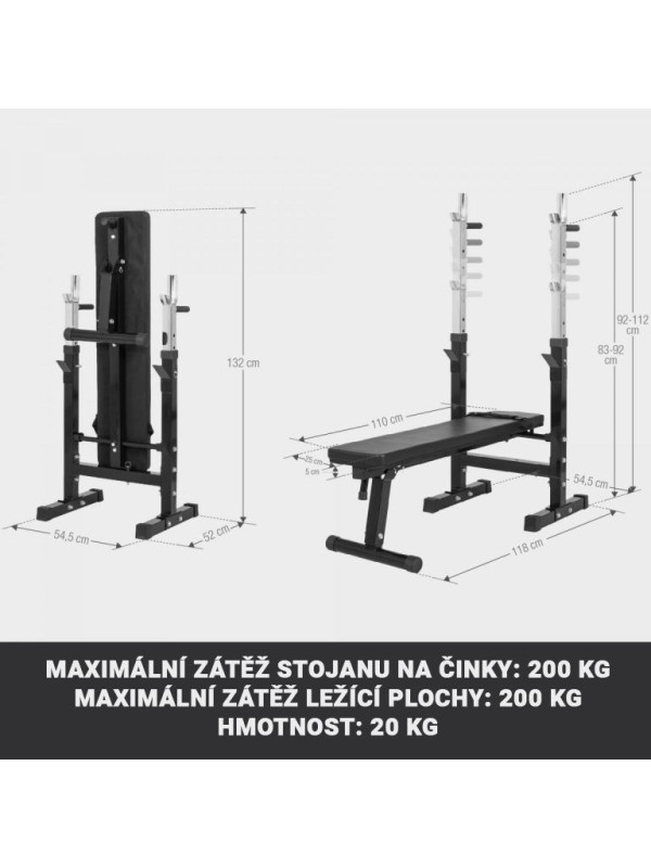 Pevná oceľová konštrukcia s pogumovanými nožičkami zaručuje stabilitu aj pri vyššej záťaži. Stojan na činky je výškovo nastaviteľný v 5 úrovniach (92–112 cm), lavica má nosnosť až 200 kg. Povrch lavice je ľahko udržiavateľný a odolný voči opotrebeniu. Praktické skladanie šetrí miesto, keď lavicu nepoužívate.