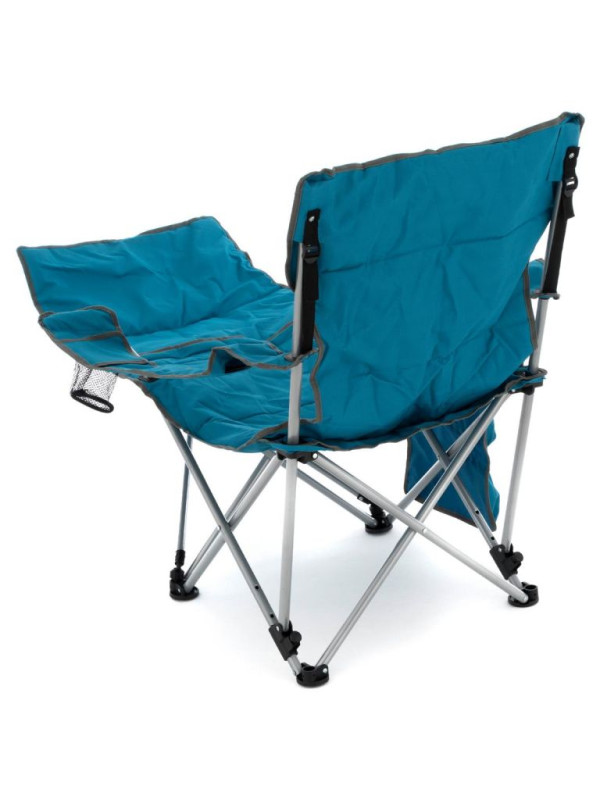 Kempingová stolička alebo kempingové lehátko - vyberte si. S touto kempingovou stoličkou môžete sedieť v uvoľnenej polohe celé hodiny alebo si ľahnúť a luxusne si odpočinúť. Stolička je sklopná a ľahko prenosná, rýchlo pripravená na použitie a rovnako rýchlo znovu zabalená. Vďaka praktickej odolnej taške možno stoličku vziať kamkoľvek. Dva integrované držiaky nápojov v podrúčkach skladacej stoličky je možné zakryť, keď sa nepoužívajú. Zároveň ponúkajú veľmi užitočnú možnosť uloženia nielen plechoviek a fliaš, ale aj príslušenstva ako je napr. mobilný telefón. Okrem toho je na bočnej strane stoličky praktická úložná brašna na zips a 3 vrecká.