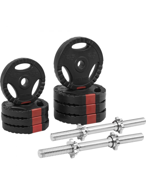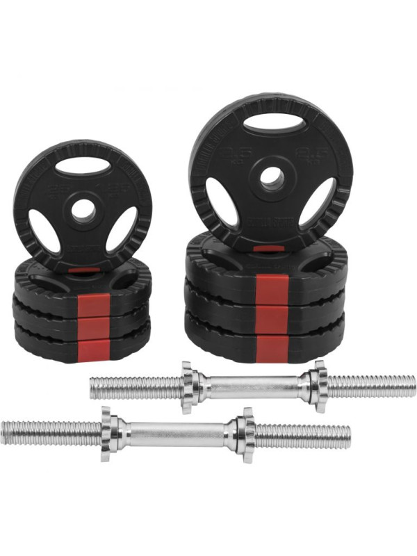 Sada činiek ponúka mnoho možností účinných cvikov, ktoré posilňujú paže, trup a nohy. S našou sadou činiek Gripper 30 kg získate vysoko kvalitné cvičebné náradie, ktoré vás bude v posilňovni sprevádzať mnoho rokov. Jej záťažové kotúče sú potiahnuté robustným plastom, ktorý chráni podlahu pri umiestňovaní závaží. Hodí sa na činkové tyče s priemerom 30 mm a možno ich použiť aj ako doplnok k činke alebo bradlám. Na zabezpečenie diskov slúžia praktické a ľahko použiteľné hviezdicové zámky. Tyče činiek padnú dobre do ruky. Na najmenšiu záťaž stačí použiť činky s miernou hmotnosťou 2,5 kg. Zvyšujte svoj výkon po malých krokoch. Týmto spôsobom posilňujete svaly bez toho, aby ste preťažovali kĺby.