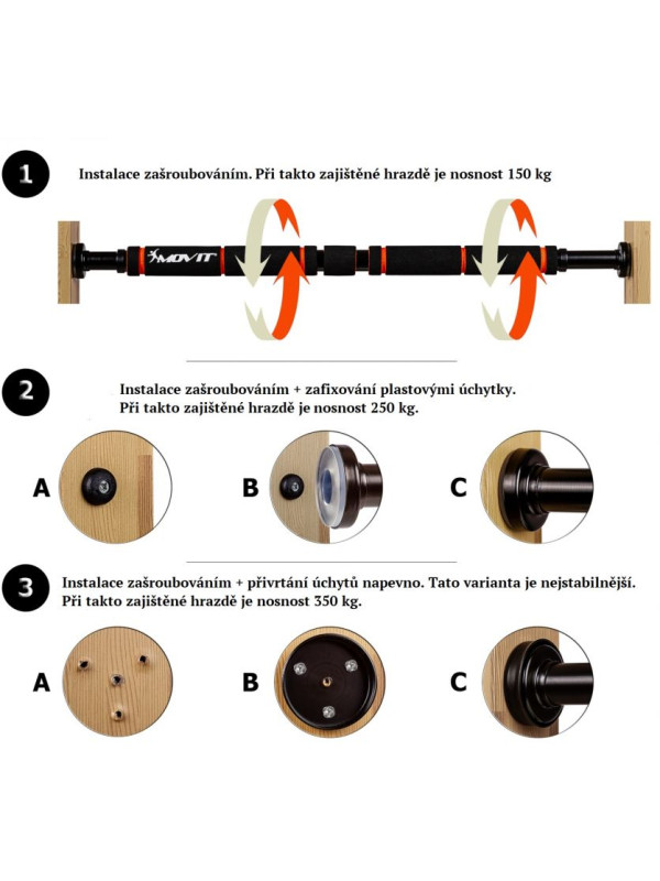 Hrazda na cvičenie MOVIT® pre pohodlné cvičenie doma aj na cestách! Nastaviteľná dĺžka, vďaka ktorej ju môžete nainštalovať individuálne do každých dverí. Dĺžka sa môže meniť od 63 cm do 100 cm jednoduchým odskrutkovaním vonkajšej kĺbovej hlavice pomocou závitu. Ideálne pre posilňovanie chrbtových partií, brucha a paží. Hrazdu je možné upevniť do vrchnej časti dverí pre príťahy a posilňovanie chrbta a paží, ale aj do spodnej časti dverí pre sedy-ľahy a posilňovanie brušných svalov. Vďaka jednoduchej inštalácii je možné hrazdu vždy po cvičení zložiť. Hrazdu je tiež možné pripevniť skrutkami, ktoré sú súčasťou balenia, ale nie je to podmienkou.