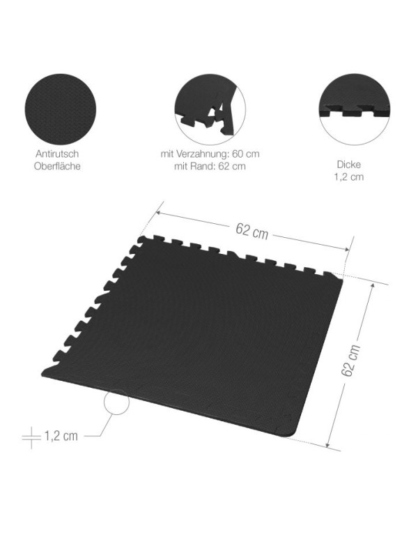 Materiál: vysoko kvalitná pena s proti-šmykovým povrchom, odolná proti oderu a šetrná k pokožke.- 6 štvorcových podložiek s dĺžkou strany 60 cm