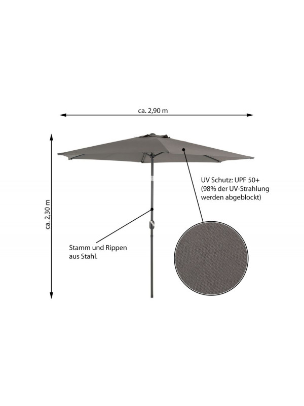 Slnečník má priemer 2,9 metrov a povrchový materiál zo 100 % polyesteru, ktorý je veľmi nenáročný na údržbu, odpudzuje vodu, je odolný voči natrhnutiu, vplyvom počasia a neprepúšťa UV lúče (UPF 50+).