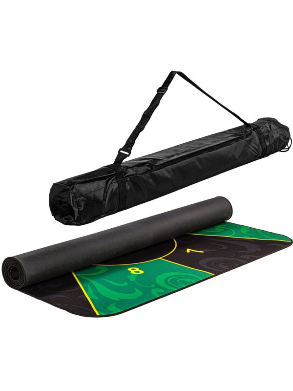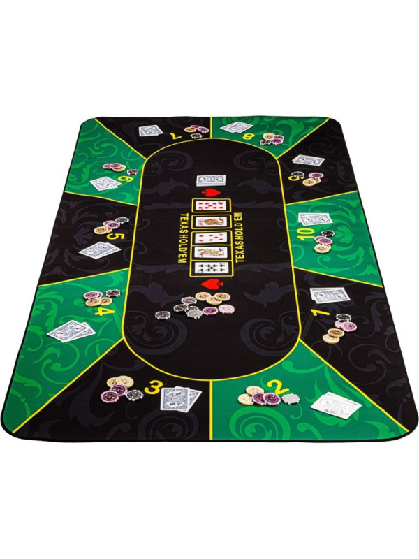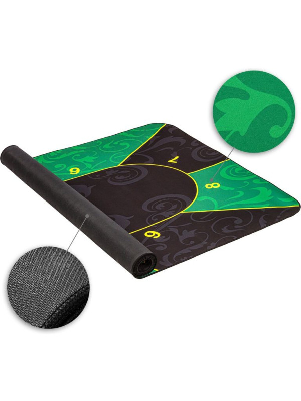 Pokerová podložka je vhodná až pre 10 hráčov. Predná strana je vyrobená z vodoodpudivého polyamidu. Materiál je príjemne mäkký a hladký na dotyk (podobne ako podložka pod myš). Zadná strana je vyrobená z protišmykového prírodného kaučuku - gumový povlak zabraňuje skĺznutiu podložky. Podložku možno zrolovať, aby sa ušetrilo miesto, a možno ju ľahko vziať kamkoľvek prostredníctvom priloženej tašky.