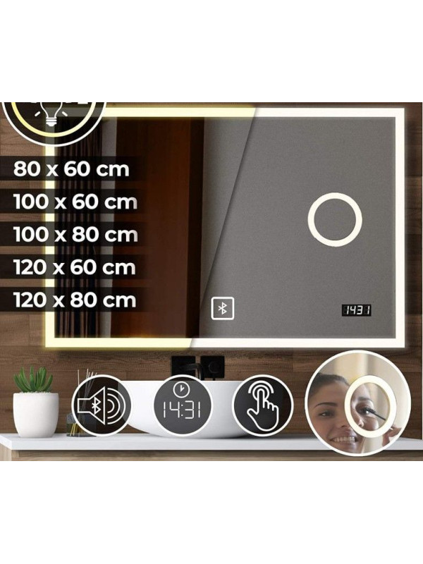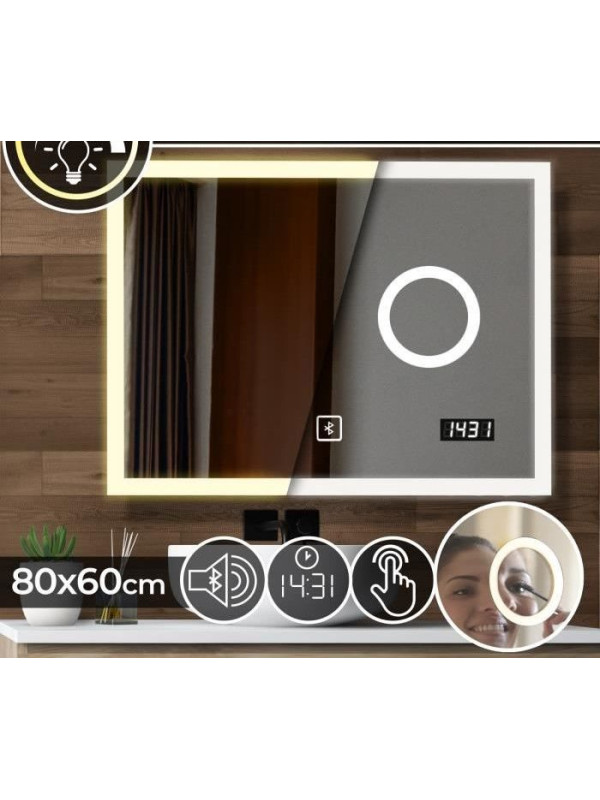 Toto kúpeľňové zrkadlo s osvetlením má digitálne hodiny a bluetooth reproduktor rovnako ako kozmetické zrkadlo. Dotykové zrkadlo poskytuje špeciálne okolité osvetlenie, ktoré zodpovedá vašej nálade. Nastaviteľné od teplého po studené svetlo. Toto zrkadlo je bez medi a je obzvlášť odolné proti vlhkosti. Pri každom rozsvietení zrkadla sa ozve zvukový signál.