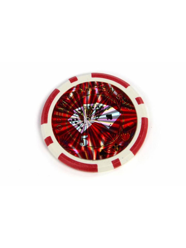 "50 kusových žetónov dizajn Ocean s potlačou s laserovým efektom so skosenými hranami - ideálne na triky sa žetónmi. Hmotnosť: 11 g hodnota 5 Farba: Červená Rozmery: _4cm, výška 3mm"