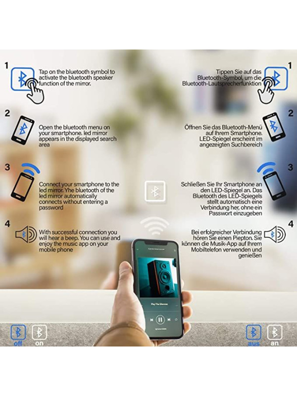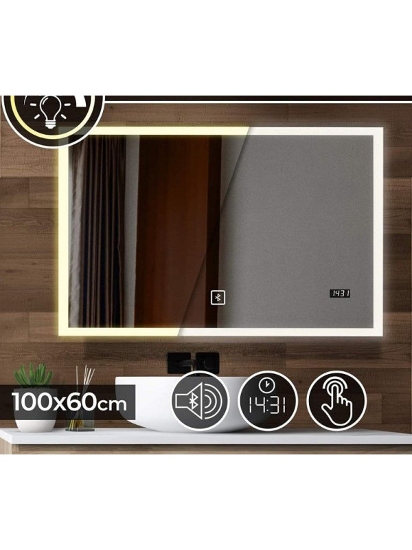 Toto osvetlené kúpeľňové zrkadlo má digitálne hodiny a bluetooth reproduktor. Zrkadlo ovládané dotykom poskytuje špeciálne osvetlenie okolitého prostredia, ktoré zodpovedá vašej nálade. Nastaviteľné od teplého po studené svetlo. Toto zrkadlo je bez medi a je obzvlášť odolné proti vlhkosti.