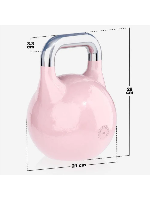 U fitness kettlebellov nie je špecifikovaný materiál ani veľkosť. Oproti tomu sú konkurenčné varianty v zásade vyrobené z ocele a majú jednotnú veľkosť. Bez ohľadu na hmotnosť zvláda každý súťažný kettlebell to isté. To vedie k väčšej bezpečnosti pri manipulácii. Robustný materiál si navyše dobre poradí s drsným kontaktom so zemou, k čomu môže dôjsť pri intenzívnom tréningu. Tu ponúkaný kettlebell je k dispozícii s rôznymi váhami, takže si môžete zostaviť set kettlebellov podľa svojich predstáv. Všetky ponúkané verzie sú vyrobené z vysoko kvalitnej masívnej liatej ocele a zodpovedajú veľkosťou a tvarom konkurenčnému štandardu. Spodná strana je sploštená. Týmto spôsobom sa činka nedobrovoľne neodvalí. A aby ste mohli na prvý pohľad rozlíšiť rôzne hmotnosti niekoľkých kettlebellov, každý váhový variant má inú farebnú povrchovú úpravu.