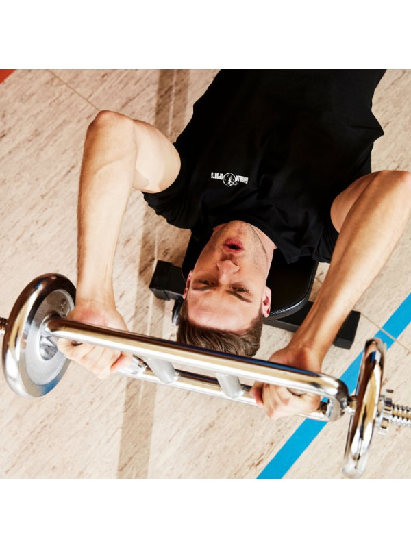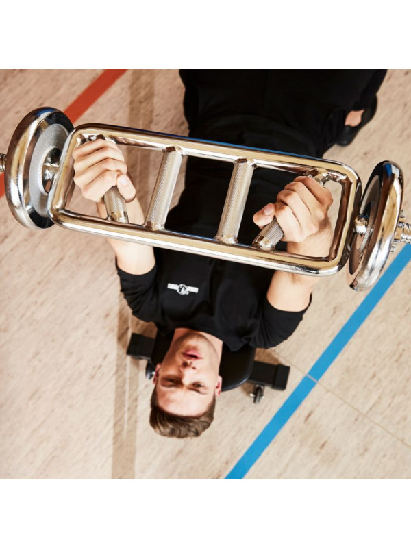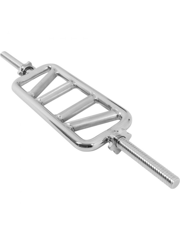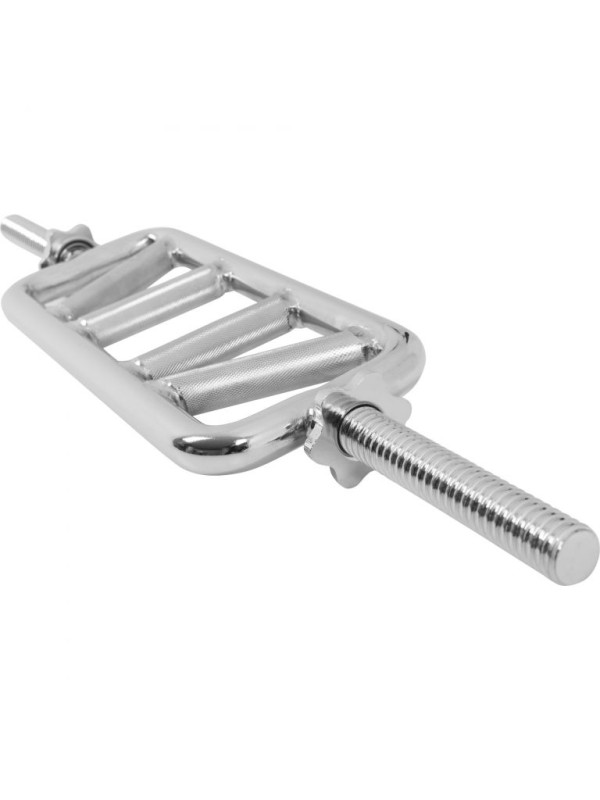 Tricepsový trenažér Diagonal v chróme od Gorilla Sports precvičuje nielen triceps, ale aj biceps. Jeho šikmé rukoväte umožňujú dve varianty úchopu, s ktorými môžete svaly nadlaktia rôzne zaťažovať. S chrómovaným trenažérom na triceps Diagonal od Gorilla Sports si môžete rozšíriť domácu posilňovňu o doplnky štúdiovej kvality, ktoré využijete na efektívne posilňovanie horných paží. Je povrchovo upravená vysoko kvalitným chrómovaním s ryhovanou rukoväťou a označením.