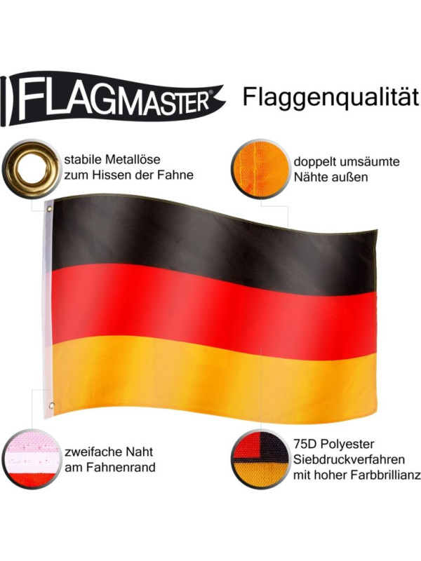 Vlajka FLAGMASTER vyrobená z robustného 75D polyesteru je absolútnou upútavkou vo vašej záhrade, na večierkoch alebo dokonca aj na športových akciách. Na ľavej strane je vystužená bielym lemom s dvoma stabilnými kovovými krúžkami na pripevnenie na vlajkový stožiar. Okraj vlajky je ušitý dvojitým švom. Potlač sieťotlačou zaisťuje vysokú farebnú brilanciu.