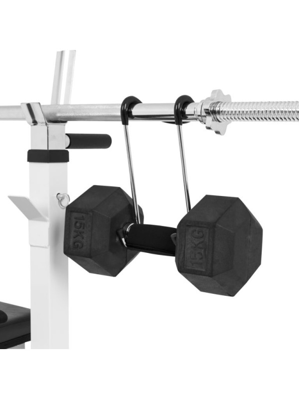Činky môžete zabaliť do protišmykovej neoprénovej podložky a pripevniť ich tak k vyššej tyči. V ďalšom kroku ich vytlačíte zo stojana rovnako ako pri bežnom tlačení s činkou. Ušetríte si tak prácu so zdvíhaním činiek z podlahy a nemusíte začínať cvičenia z najnižšej polohy. Samotný materiál hákov je vyrobený z vysoko kvalitného chrómu. Vďaka ich stabilite a kvalitnému spracovaniu s nimi môžete trénovať dlhú dobu a zintenzívniť svoj tréning.