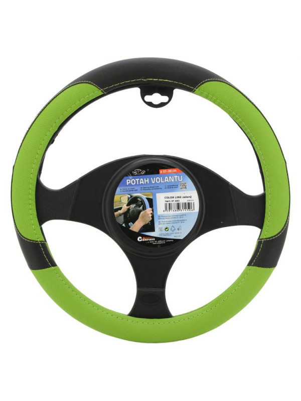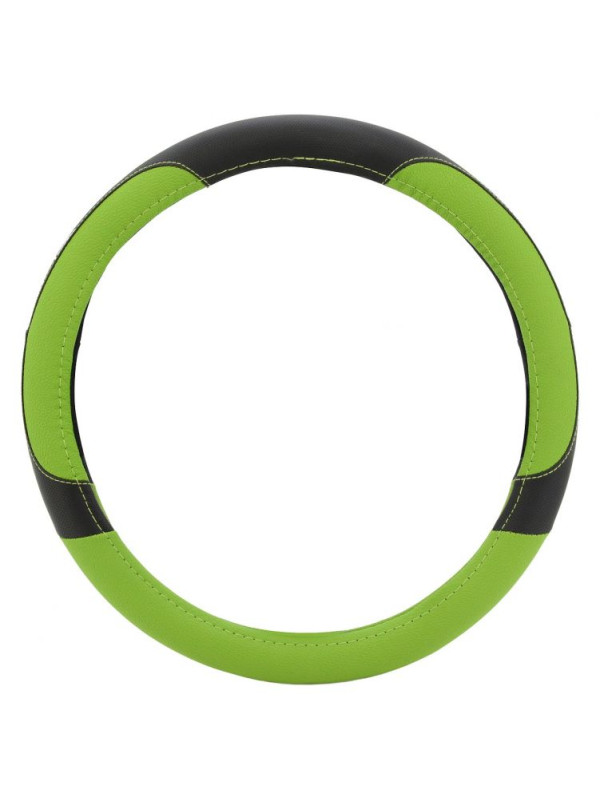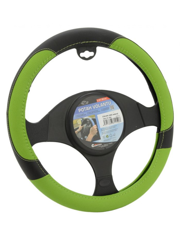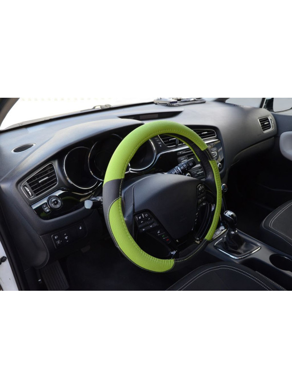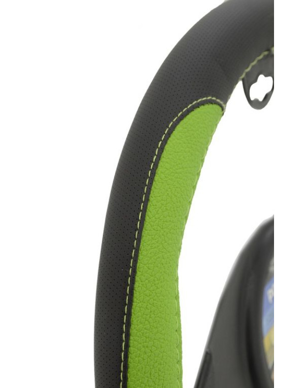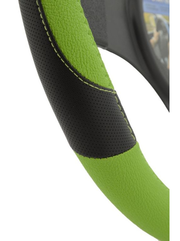 Štýlový poťah volantu s unikátnym prevedením, v pastelovo zelenej farbe s čiernym podkladom a pastelovo zeleným prešívaním. Poťah je príjemný na dotyk, ergonomicky tvarovaný s perforáciou pre uľahčený úchop. Poťah chráni volant pred opotrebením a zlepšuje riadenie.