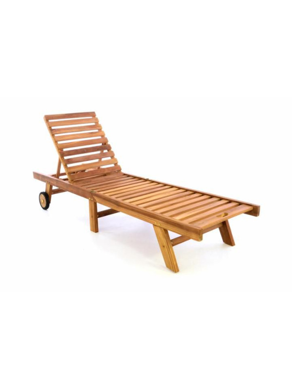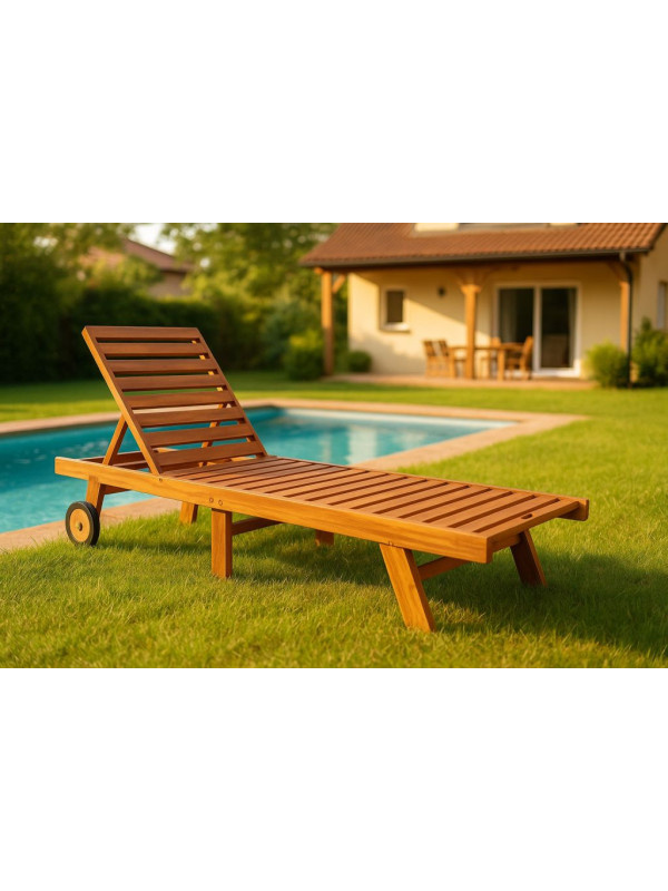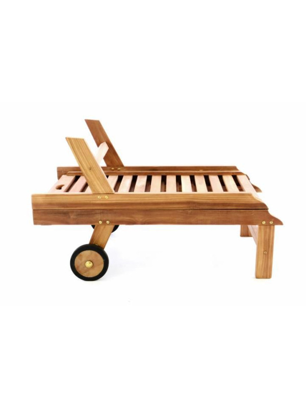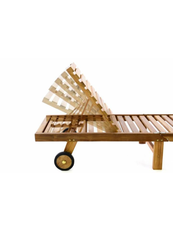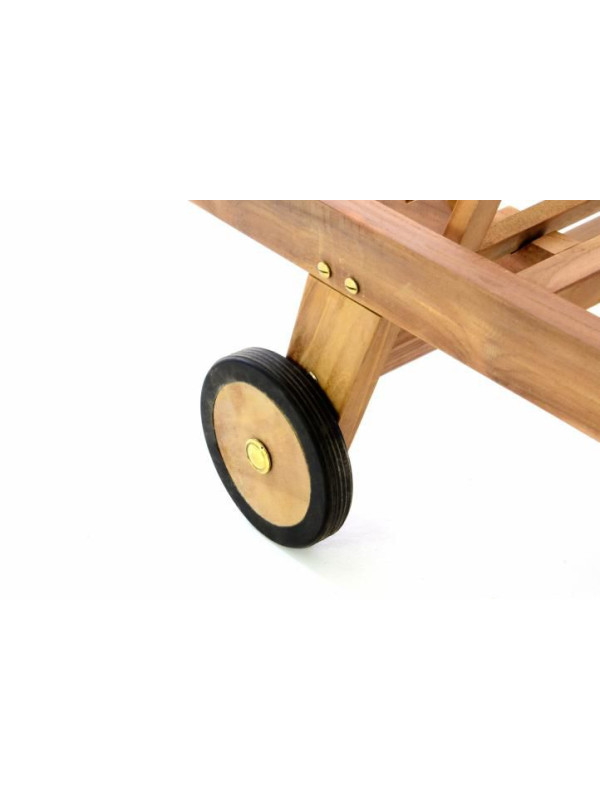 Kvalitné teakové ležadlo s gumou potiahnutými kolieskami a nastaviteľnou opierkou hlavy.