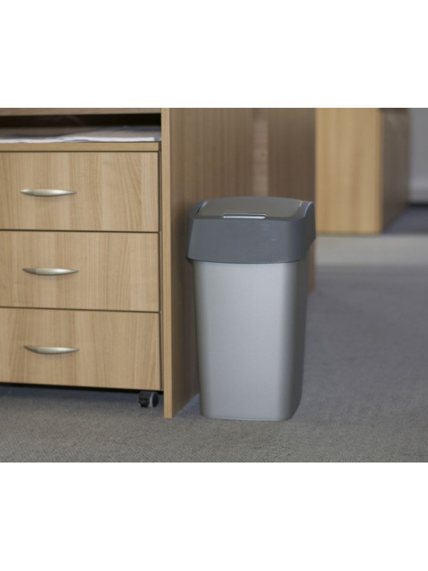 Praktický odpadkový koš Flipbin Curver v šedostříbrné a šedé barvě. Dva stupně otevření víka. Pro drobnější odpad lze použít první stupeň tzv. malé otevření na 78°, pro větší odpad velké otevření na 100°. Tento systém pomůže udržet víko čisté.