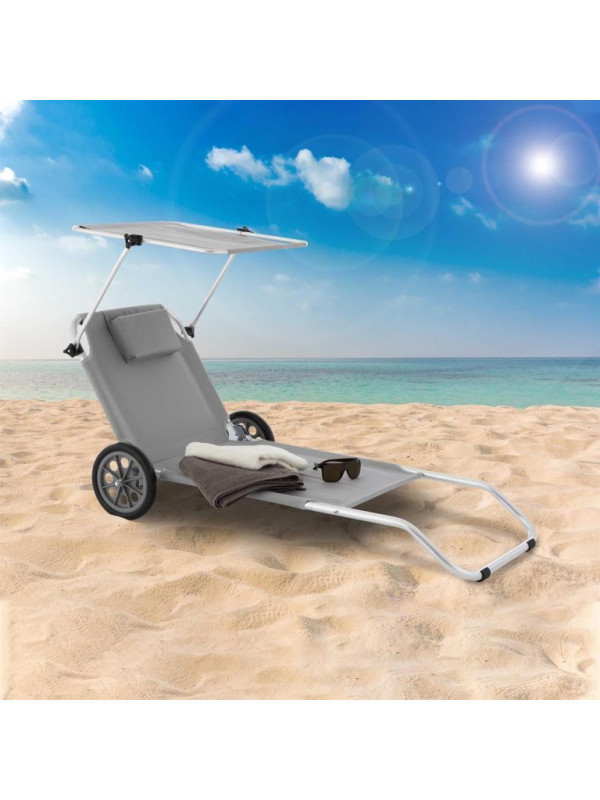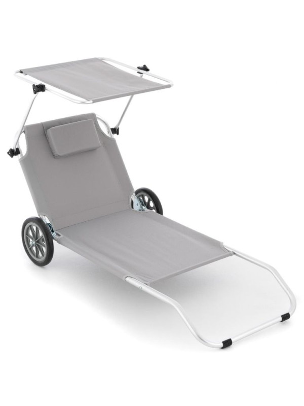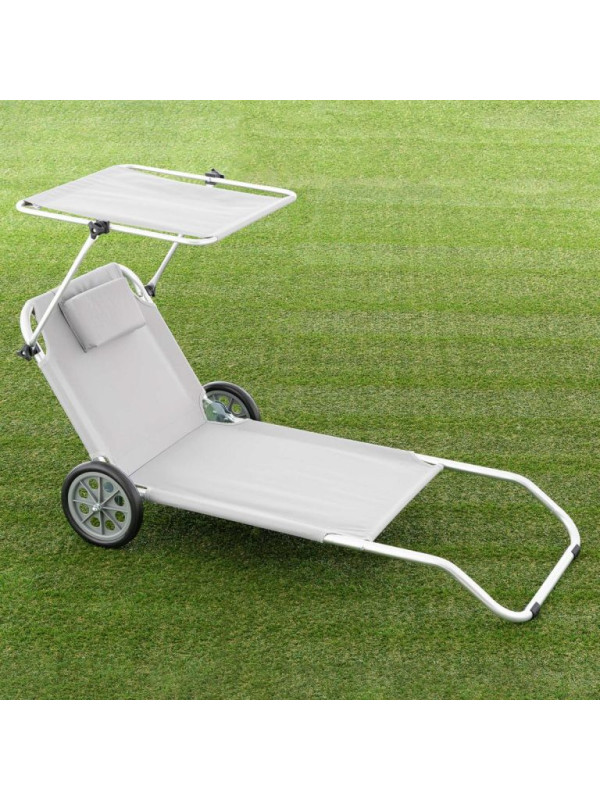 Záhradné skladacie ležadlo s kolieskami a strieškou, sivé