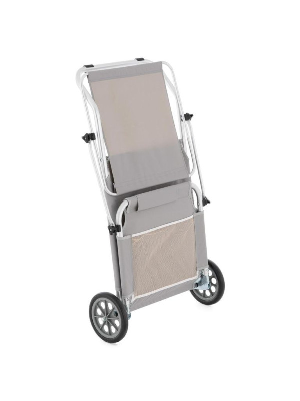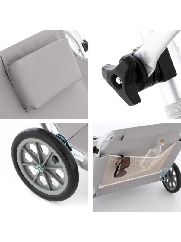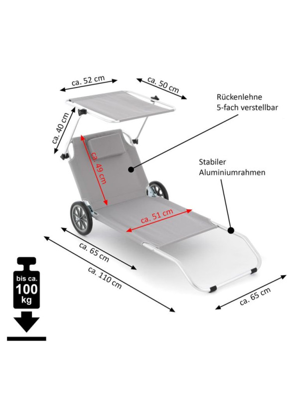 Skrášlite svoju terasu alebo záhradu týmto praktickým lehátkom, ktoré je vhodné na vnútorné aj vonkajšie použitie, k bazénu alebo pri kempovaní. Môže byť použité aj ako prepravná pomôcka pre Vaše plážové náčinie. Slnečnú clonu je možné plynule nastavovať podľa potreby, aby nedošlo k popáleniu. Kvalitný hliníkový rám a rýchloschnúca ležacia plocha odolná proti roztrhnutiu, praktická relaxačná opierka hlavy pre príjemný komfort ležania. Operadlo nastaviteľné v 5-tich smeroch s praktickou sieťovanou priehradkou zaisťuje príjemné pohodlie pri ležaní. Skladacia, pre úsporu miesta - ľahká preprava vďaka 2 stabilným kolieskam.
