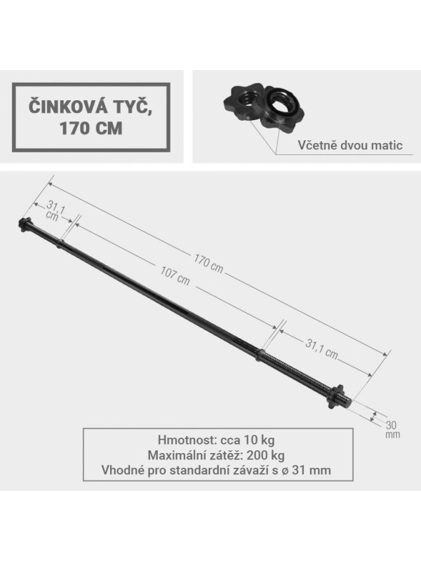 Aj bez stojanu na činkové tyče možno trénovať niekoľko svalových skupín, ako sú ramená, paže, chrbát a nohy. Táto činková tyč sa stáva základnou pomôckou pre vytvarovanie pevného hrudníka. Dodávané s dvomi maticami na bezpečné zaistenie i veľkých hmotností.