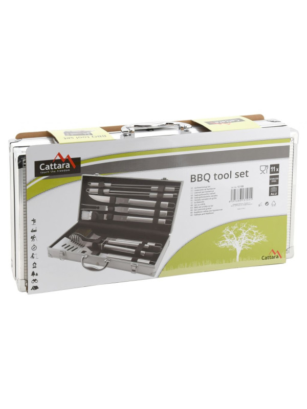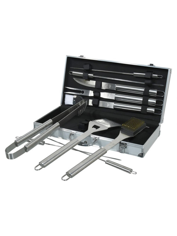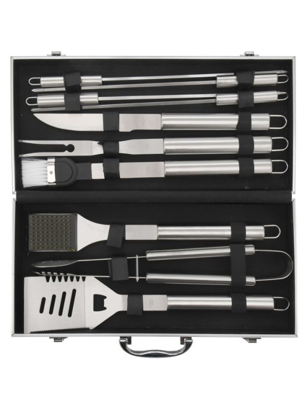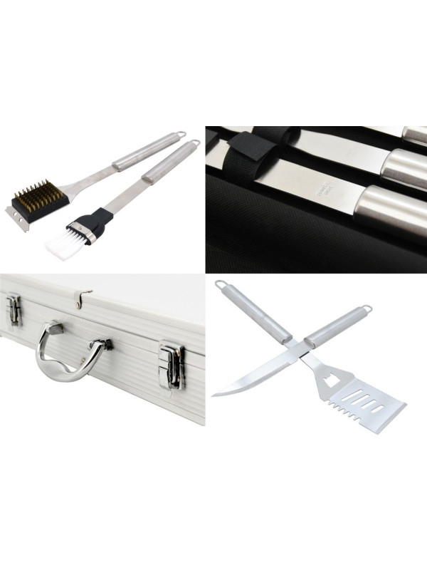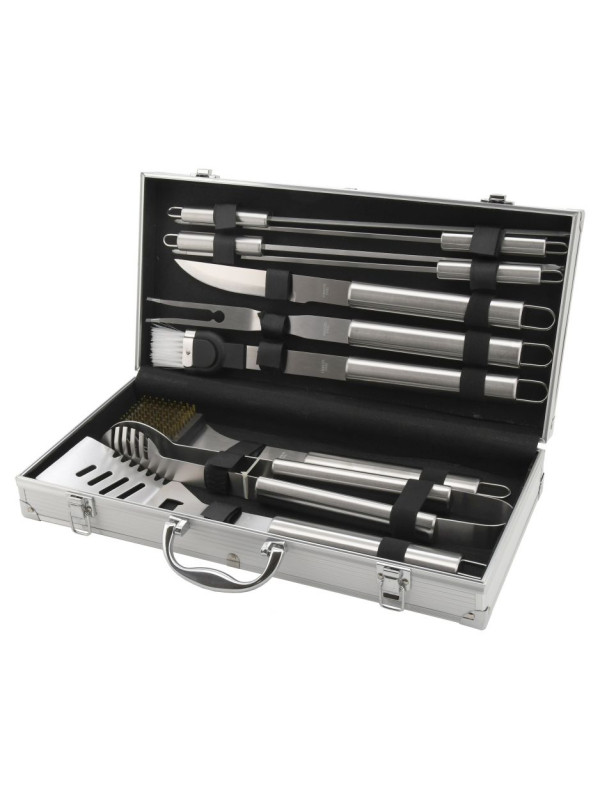 Profesionálna sada 11 ks náradia, so všetkým potrebným pre grilovanie i následnú údržbu grilu. V sade sa nachádza obracačka s precízne zabrúsenou hranou vybavená vlnitým ostrím, otváračom zátok a otvormi pre odtok. Kliešte, špeciálne tvarované pre istý úchop najrôznejších pokrmov, kefa pre údržbu grilu, kedy samotná kefová časť je z mosadze. Nevyhnutnou časťou grilovacieho náradia je aj dvojzubá vidlička, štetec so štetinami z nylonu pre potieranie, či mašľovanie pokrmov, nôž na porcovanie a 4x grilovacie ihlice s hrotmi brúsenými do špičky. Všetko náradie je kvalitne spracované z nerezovej ocele, nie je nijak zbytočne tvarované, čo významne uľahčuje čistenie. Rukoväte jednotlivých nástrojov sú kruhového prierezu a výborne padnú do ruky. Všetky nástroje možno zavesiť na háčik. Sada je úhľadne umiestnená v transportnom kufri, hodí sa najmä náročnejším užívateľom, jeho prehľadnosť a zoznam rôznych nástrojov však ocení ktokoľvek. Sada je primárne určená na využitie doma na záhrade.