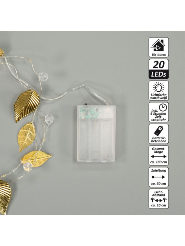Párty a slávnostné osvetlenie - tieto rozprávkové svetlá s priehľadnými plastovými korálkami a lístkami v zlatej farbe sú vhodné pre každú slávnostnú príležitosť. Nastavte si vlastné svetelné akcenty po celý rok a vyzdobte si dom, zimnú záhradu alebo spoločenskú miestnosť. Možnosti dizajnu sa neobmedzujú. Pomocou časovača môžete rozhodnúť, kedy chcete osvetlenie zapnúť. Voľne voliteľná funkcia časovača alebo nepretržitého svietenia.