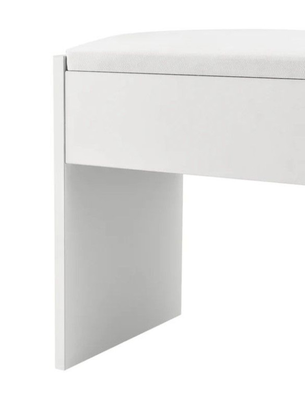 Robustná konštrukcia z bielych drevených dosiek zaisťuje dlhú životnosť a jednoduchú údržbu. Povrch je odolný proti poškriabaniu a ľahko sa čistí. Montáž je rýchla a zvládne ju každý behom pár minút. Ochranné nôžky chránia podlahu pred poškodením.