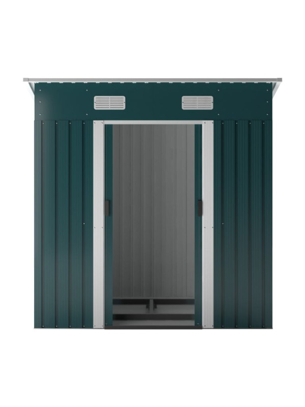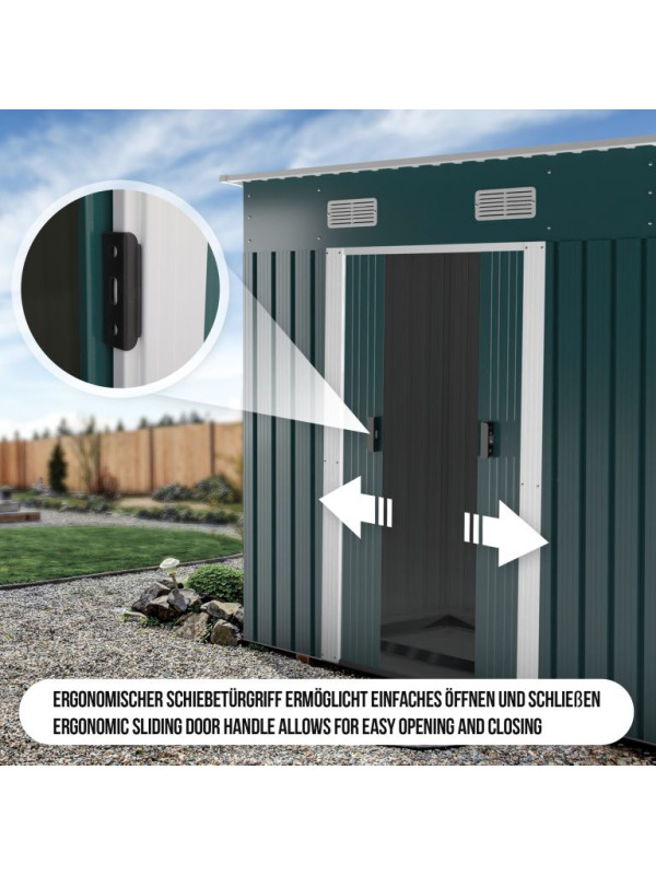 Dvere tohto domčeka sú posuvné, čo zaisťuje ľahký prístup a maximalizuje priestor vo vnútri. Navyše štyri vetracie mriežky zaručujú optimálnu cirkuláciu vzduchu, čo je kľúčové pre udržanie vášho náradia v perfektnom stave.