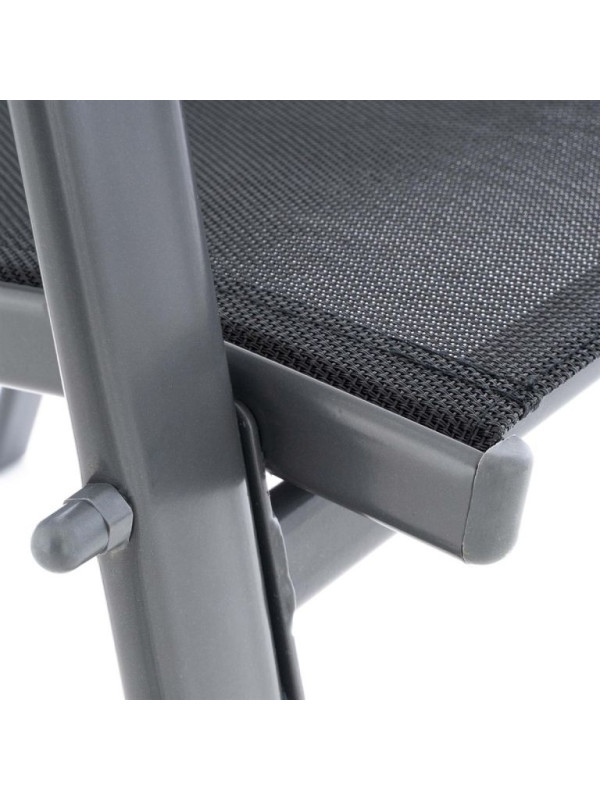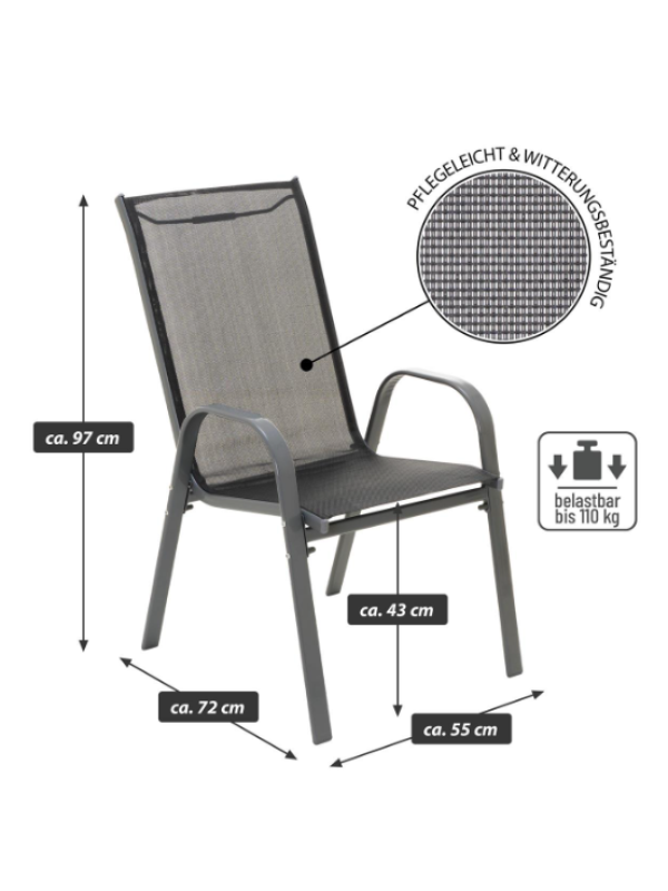 Sedadlo a operadlo stoličky sú vyrobené z čierneho elastického textilného poťahu. Stolička je vybavená podrúčkami na pravej a ľavej strane pre pohodlné sedenie. Stoličky sú stohovateľné pre úsporné uskladnenie. Materiály použité v tejto stoličke sú bezúdržbové, odolné voči poveternostným vplyvom a nevyžadujú žiadne špeciálne výrobky na údržbu.