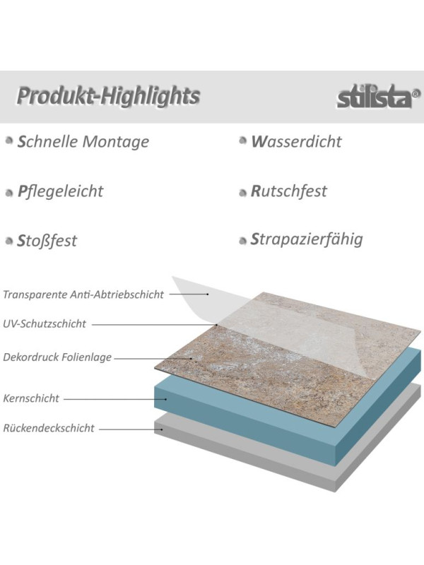Skrášlite svoj domov vinylovou podlahou v bielosivej farbe. Dlaždice majú štýlový vzhľad a ich štruktúra pôsobí veľmi realisticky. Podlahy sú vhodné pre všetky rovné a pevné povrchy. Hlavnými prednosťami je vysoká životnosť a jednoduchá pokládka. Vinyl potrebuje len malú inštalačnú výšku, a preto ho možno často pokladať na existujúce podlahy. Tento typ podláh sa hodí do vlhkých miestností, pretože je odolný voči plesniam i vlhku. Podlahy sú antistatické, protišmykové a tepelne a hlukovo izolačné. Sú tiež vhodné pre podlahové vykurovanie a ich údržba nie je náročná.