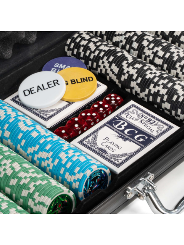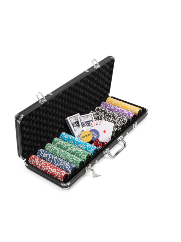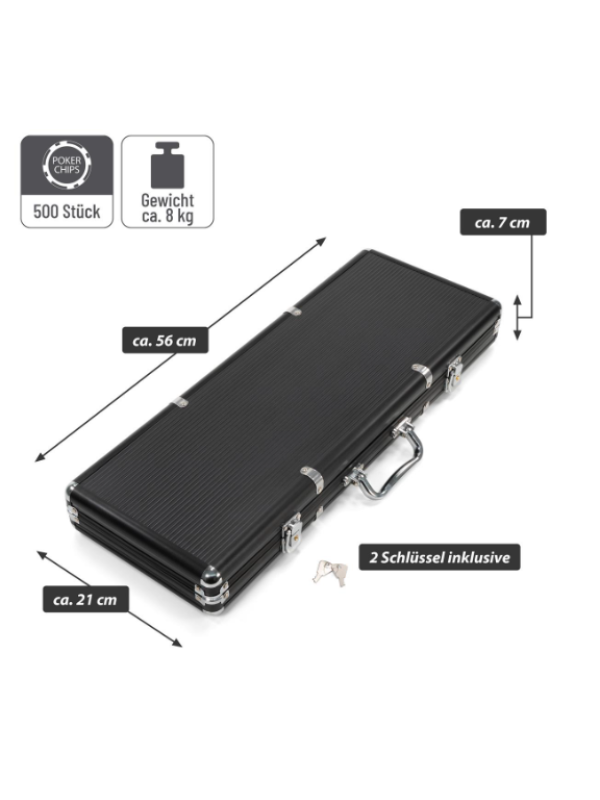 Pokerový herný set s 500 vysoko reflexnými laserovými žetónmi v modernom dizajne. Čipy majú kovové jadro a hmotnosť čipu 11g. Sada kufrov obsahuje pokrové mince (žetóny), malý / veľký blind a tlačidlo dílera, 2 sady pokrových kariet a 5 kociek. Všetko príslušenstvo je možné uložiť do polstrovaného hliníkového puzdra. Pevné a elegantné puzdro z hliníka, má 2 uzamykateľné pracky. Pohodlne sa do neho zmestí všetko herné náčinie. Herná sada obsahuje: 1 tlačidlo dílera, 1 tlačidlo pre „small blind" a „big blind", 5 kasínových kociek, 2 balíčky hracích kariet po 54 dielikoch, 500 pokrových žetónov po 12 gramoch, ktoré sa líšia v rôznych hodnotách a farby a majú vysoko reflexná laserová tlač. Vďaka priloženému nemeckému hernému návodu si pri tejto spoločenskej hre rýchlo užije veľa zábavy aj pokerový začiatočník. Súprava 500 poker obsahuje všetko, čo potrebujete pre príjemný večer pokru. Vysoko reflexné laserové čipy majú kovové jadro s HMOTNOSŤOU ČIPU 12g so zodpovedajúcou potlačou. To ocenia najmä ambiciózni hráči pri skladaní a miešaní. Na tomto modeli sme spolupracovali s profesionálnymi hráčmi pokru, aby sme zaistili optimálnu distribúciu žetónov. Napríklad v našej sade nie sú žiadne žetóny s hodnotou 1, pretože tie sa v pokri obvykle nepoužívajú. V našom sortimente máme veľký výber žetónov v rôznych prevedeniach as rôznymi nominálnymi hodnotami, rovnako ako podložky pod stôl, pokrové stoly a ďalšie príslušenstvo. Nevhodné pre deti do 7 rokov, nebezpečenstvo udusenia. Používajte pod dohľadom dospelej osoby.