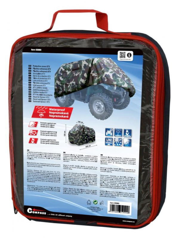 Ochranná plachta pre štvorkolku je vyrobená z veľmi odolného nepremokavého materiálu. Plachta je ideálna proti znečisteniu štvorkolky, zabraňuje aj námraze. Jednoduché univerzálne upevnenie. Balené v praktickom, na zips uzatvárateľnom balení, do ktorého je možné plachu po použití ľahko zložiť a uskladniť. Jednoduché upevnenie plachty - iba sa nasadí na štvorkolku, zo spodu sa upevní časť so všitou gumou za vhodné záhyby. Predná aj zadná časť plachty je osadená pevnými pútkami, pomocou ktorých je možné plachtu ešte pevnejšie upevniť, napríklad gumovým lanom a pod (nie je súčasťou dodávky).