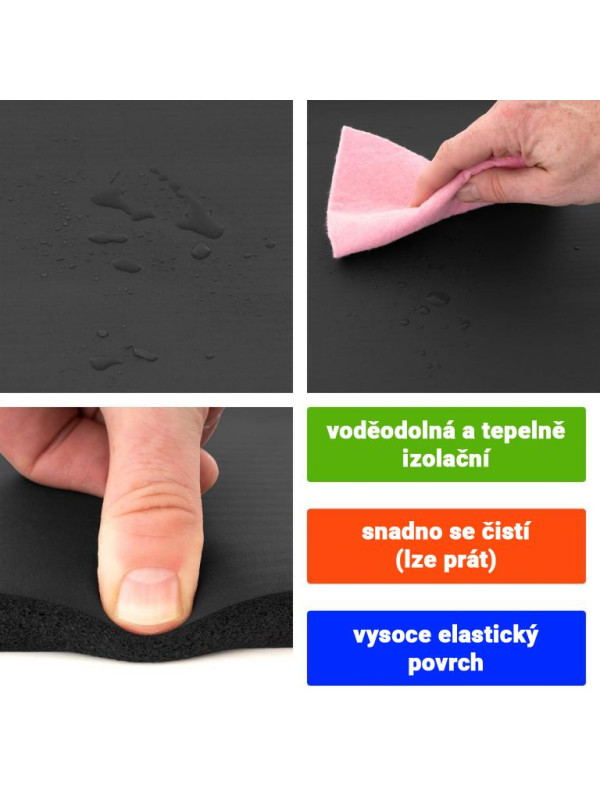 Fitness podložka je odolná proti roztrhnutiu a pošmyknutiu, je tiež vodeodolná (umývateľná) a tepelne izolačná, preto je vhodná aj na kempovanie. Okrem toho tlmí nárazy, takže je šetrná ku kĺbom. Bez zmäkčovadiel (bez ftalátov). Táto vysoko kvalitná gymnastická podložka z peny šetrnej k pokožke presvedčí výškou (hrúbkou) 15 mm. Po použití ju možno ľahko znova zrolovať.