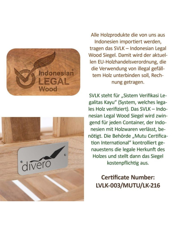 Toto rustikálne záhradné kreslo zaujme svojím mimoriadne atraktívnym dizajnom. Je ideálne na relaxáciu a odpočinok. Spôsoby použitia sú rozmanité: či už v záhrade ako záhradné stoličky, balkónové kreslo, ako kreslo na verande, pri bazéne alebo vovnútri. Teak je nielen krásny na pohľad, ale sa aj ľahko udržuje. Má dlhú životnosť a je odolný proti poveternostným vplyvom, je tak ideálny pre vonkajšie použitie. Použitý teak pochádza z udržateľného, ekologicky zodpovedného a kontrolovaného lesníctva a je certifikovaný SVLK. Náš drevený nábytok je ručne vyrobený v malých výrobných spoločnostiach. Každý kus je preto jedinečný, s ručne brúseným povrchom s jedinečným žilkovaním dreva. Z tohto dôvodu sú čas od času možné malé odchýlky v rozmeroch výrobku. Stolička sa dodáva v rozloženom stave.