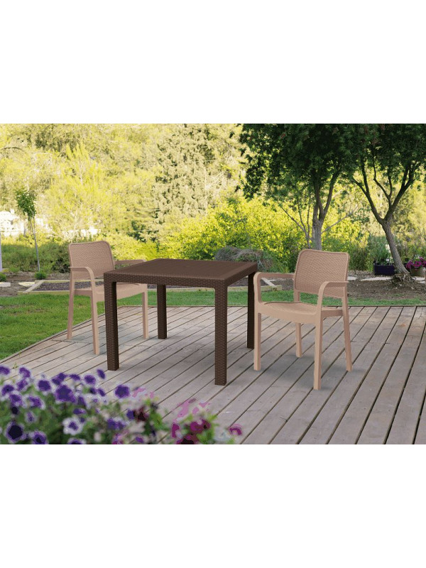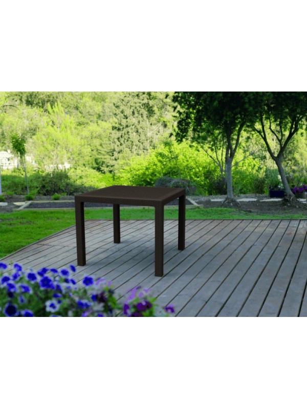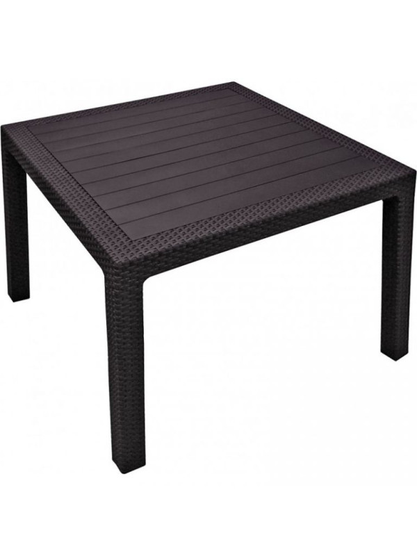 Štvorcový plastový stôl v hnedej farbe (vzor - imitácia ratanu). Jednoduchá údržba. Technické údaje: plastový stôl, farba: hnedá, rozmer: 95 x 95 x 75 cm, výrobca: Keter, hmotnosť: 8,5 kg, Obsah balenia: 1x záhradný stôl, rozmer balenia: 95 x 95 x 9 cm