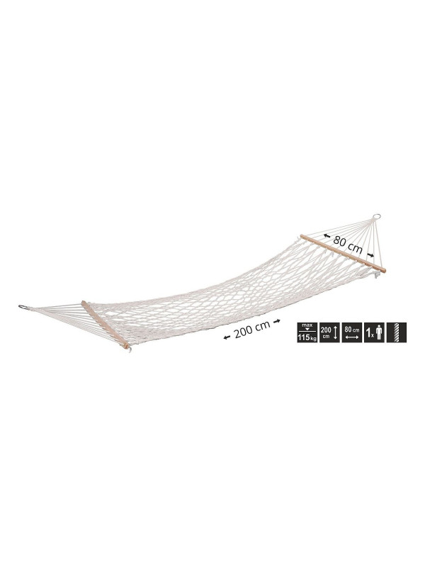 Sieť je určená pre jednu osobu a má rozmery 80 cm na šírku, 200 cm na dĺžku a maximálnu nosnosť 115 kg.