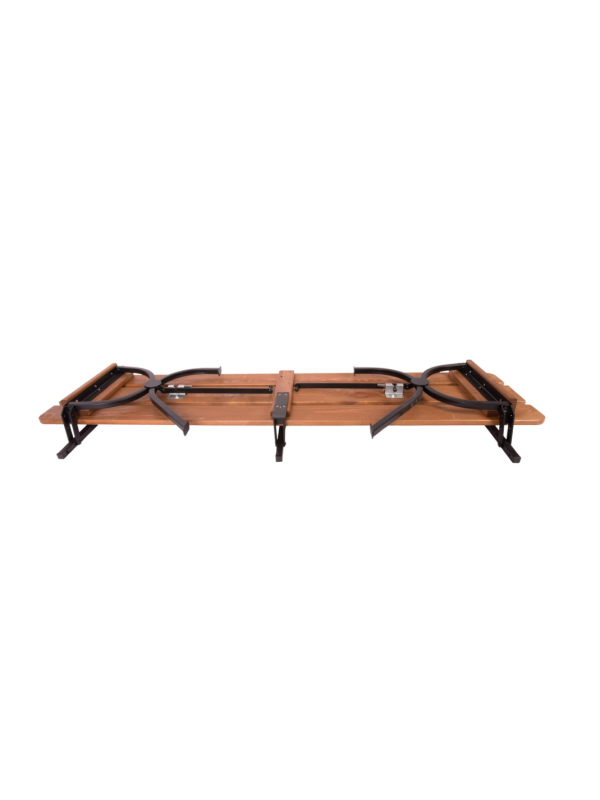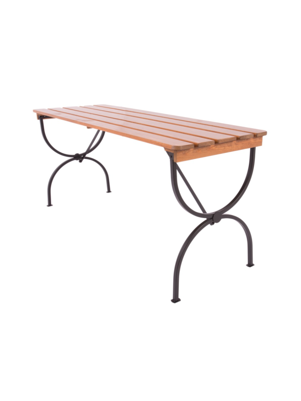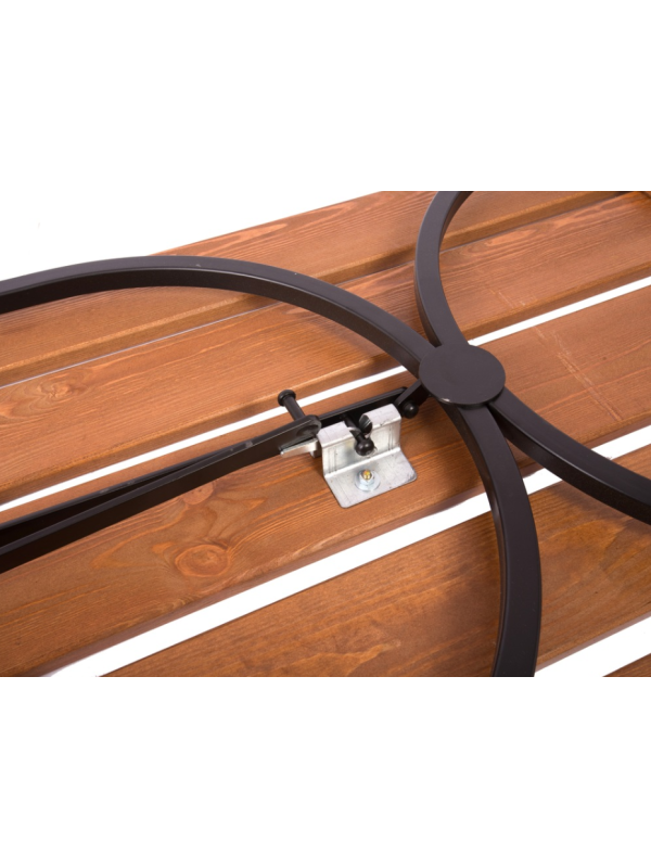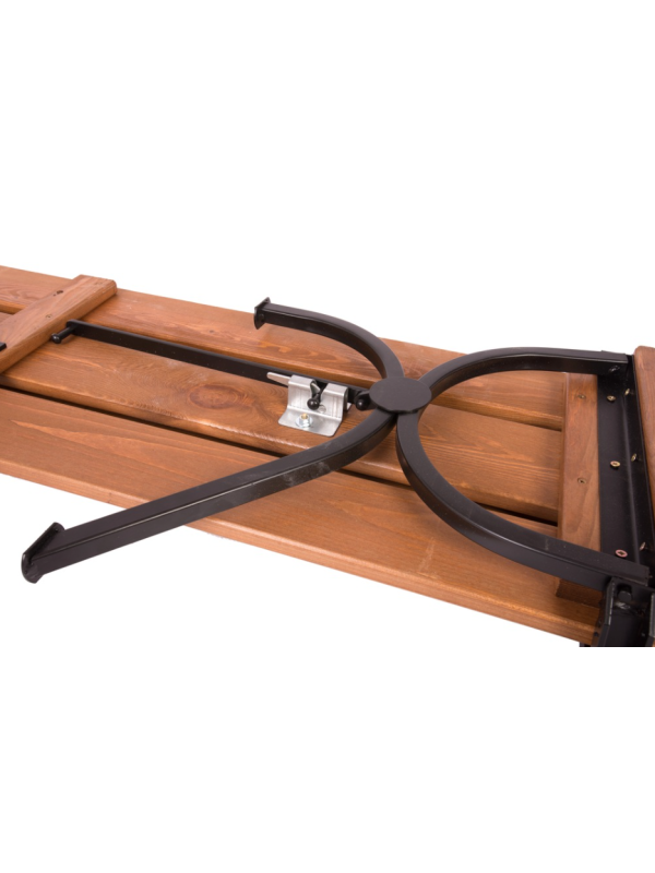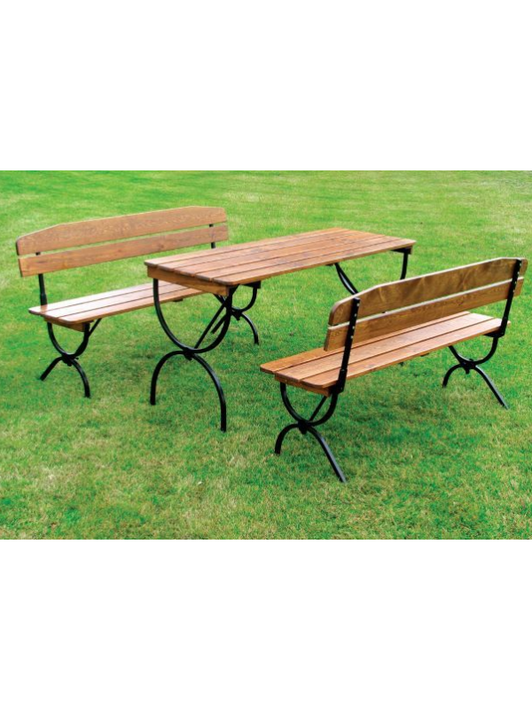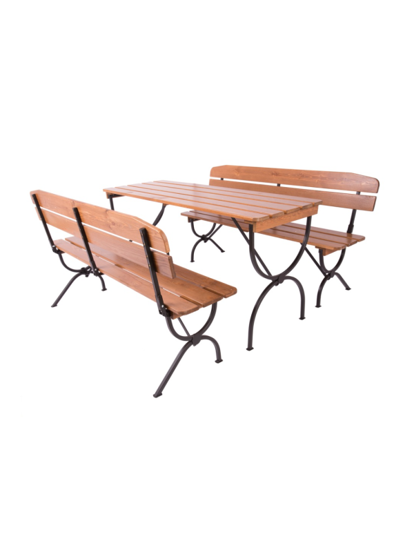 Záhradná drevená zostava, ktorá zahŕňa 2 lavice + stôl. Set je vyrobený z borovicového dreva s kovovou podnožou. Drevo je impregnované v dubovej farbe + lakované. Veľkou výhodou tohto setu je možnosť zloženia podnože a tak je jednoduchšie uloženie , či manipulácia s ním. Certifikát FSC zákazníkom zaručuje, že drevo, z ktorého je výrobok zhotovený, je kvalitné a zdravé.