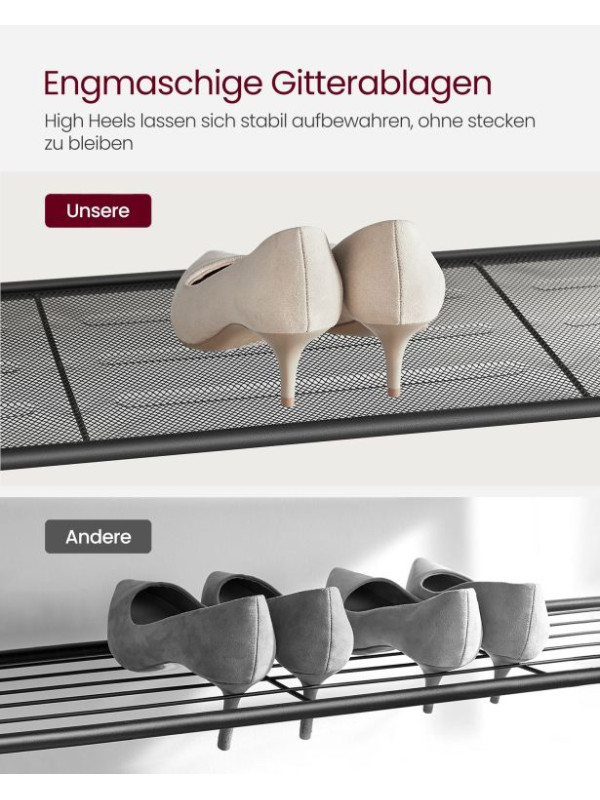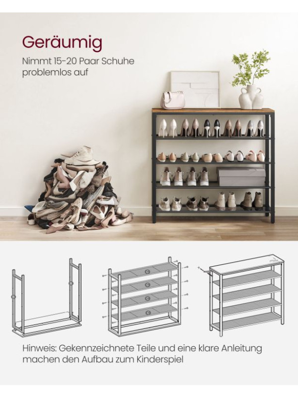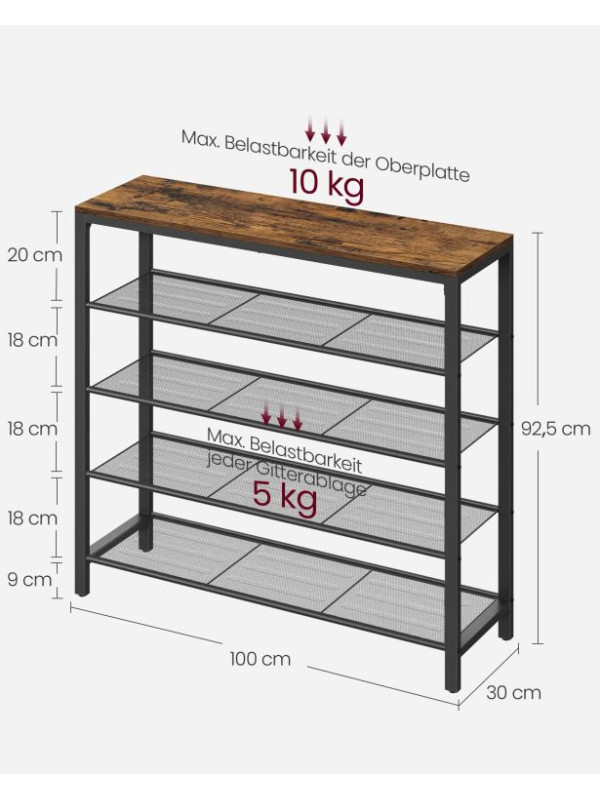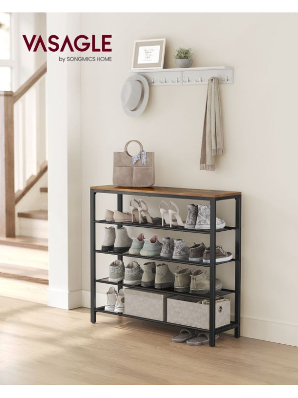 VASAGLE botník, 4 police, oceľový rám, rustikálna hnedá