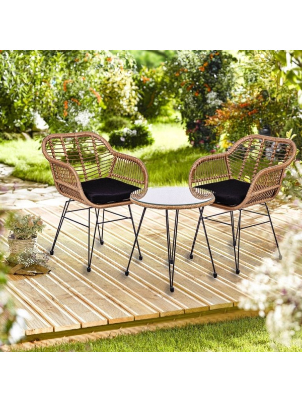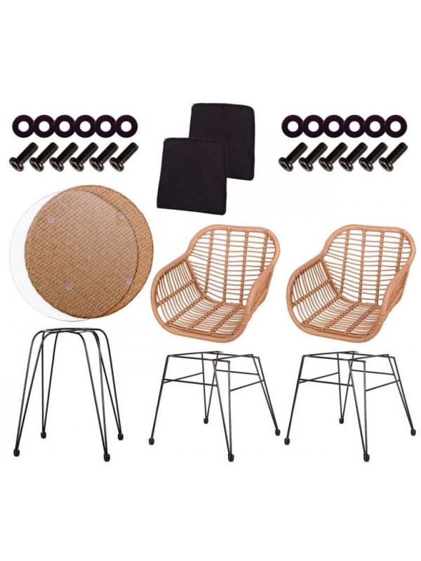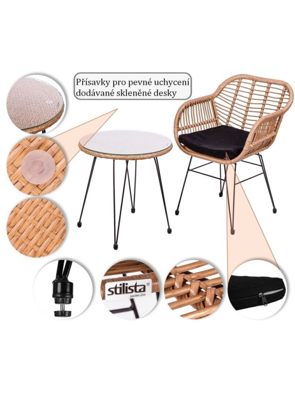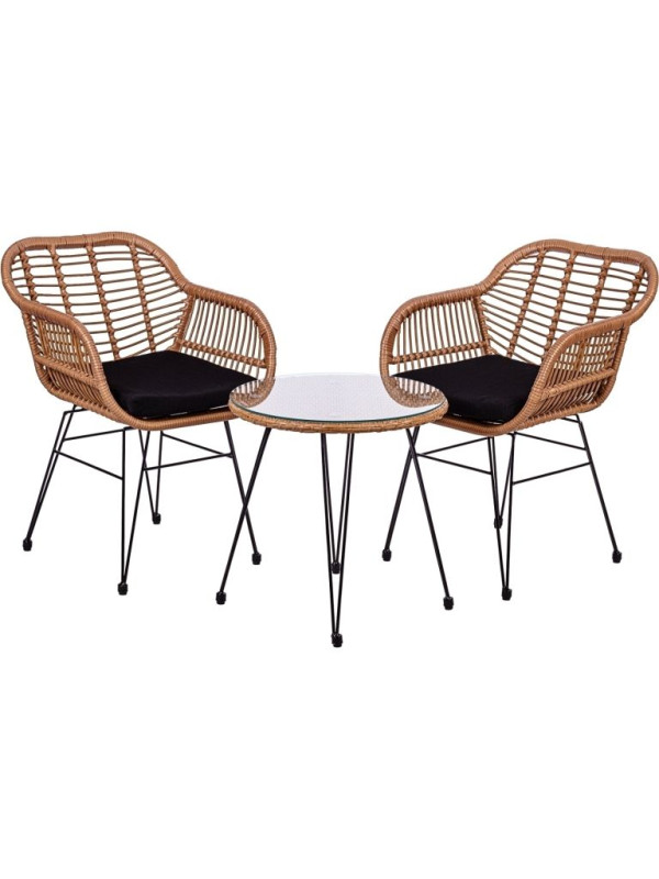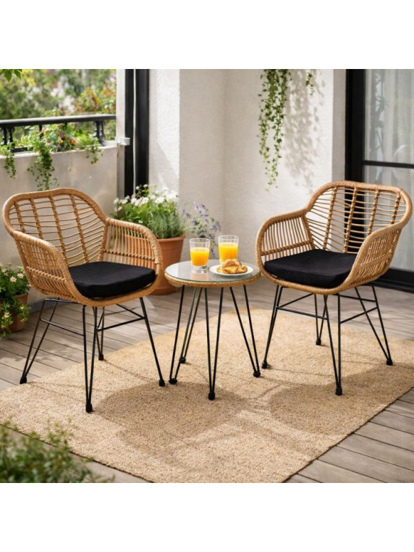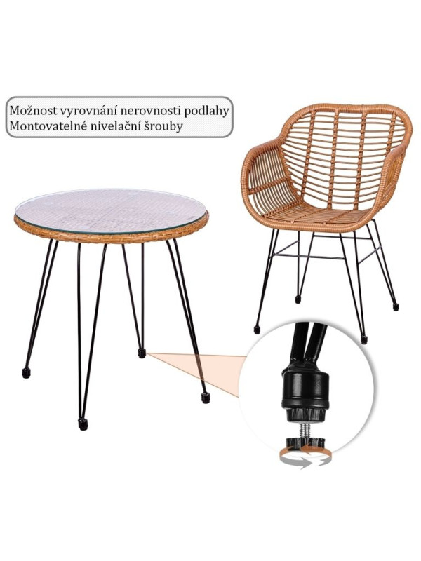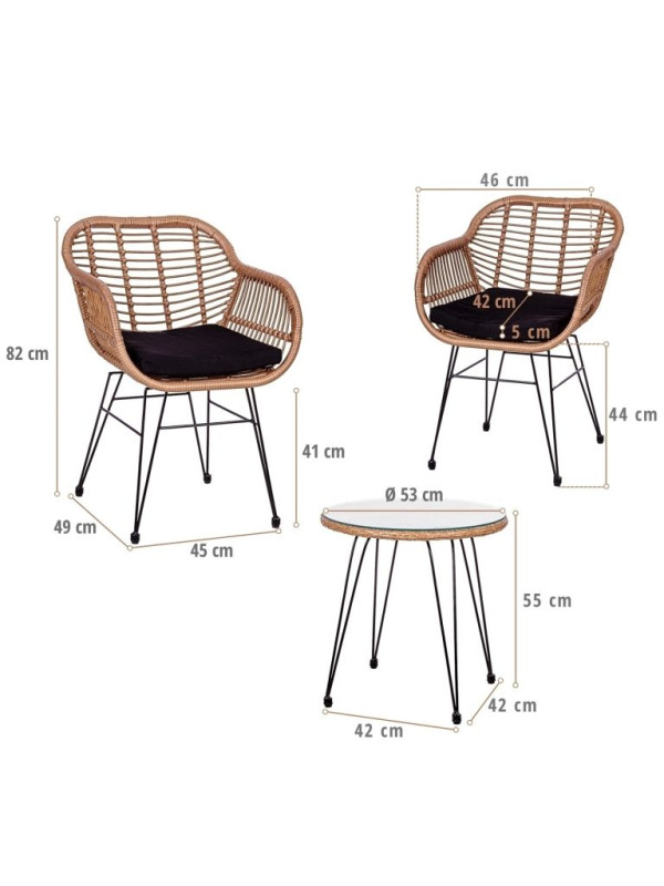 Naša balkónová súprava v ratanovom vzhľade je vhodná pre vnútorné i vonkajšie použitie. Ergonomicky tvarované kresla s 5 cm silnými sedáky poskytujú vysoký komfort sedenia. Vďaka montovatelným vyrovnávacím skrutkám na nohách stoličiek a stola je možné veľmi ľahko vyrovnať nerovnosti podlahy. Robustný rám záhradného nábytku je vyrobený z pozinkovaného a práškovo lakovaného kovu, ľahko udržiavateľné prútie je vyrobené z vysoko kvalitného polyratanu.