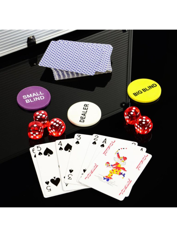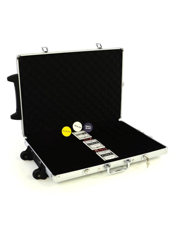 Robustný hliníkový kufor na kolieskach s tromi zámkami a výsuvnou rukoväťou je ideálny až pre 1 000 pokerových žetónov. Je potrebné dokúpiť žetóny, ktoré si môžete individuálne vybrať, zvyšok vybavenia je kompletný.